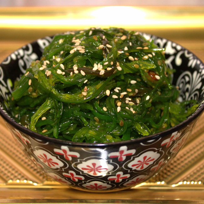 Ensalada alga wakame, con especias, toque de salsa soya y ajonjoli.
