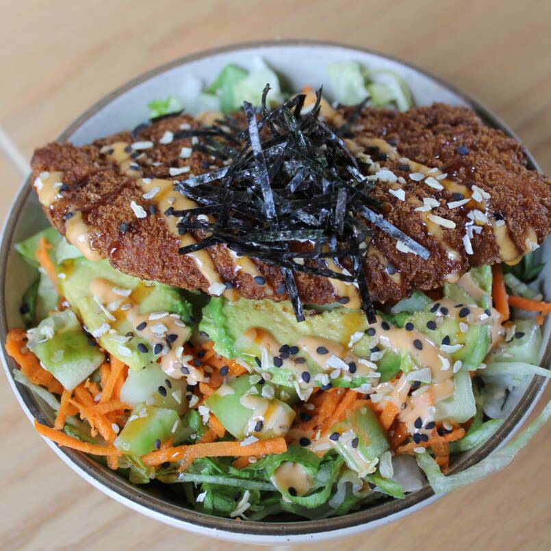 Bowl con una base de arroz blanco, acompañado de ajonjoli, salsa teriyaki, lechuga, zanahoria, pepino y aguacate, pollo frito tempura, salsa mayonesa spicy o no spicy, cebolla deshidratada y algas nori. Todos nuestros bowls tienen la misma base de arroz blanco, sésamo, salsa teriyaki, lechuga, pepino y zanahoria.
