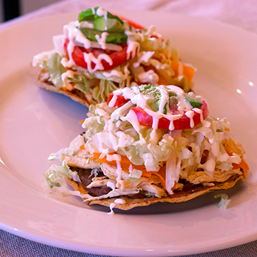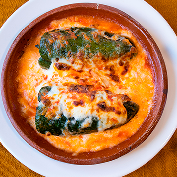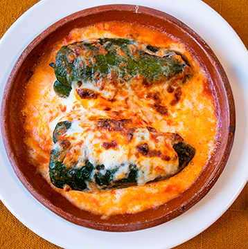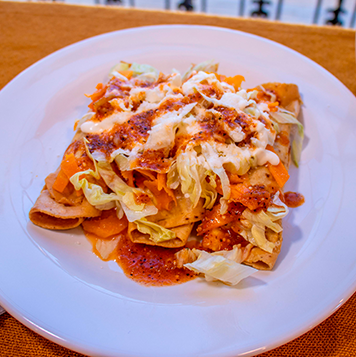 Exclusivo platillo, preparado con tortillas de harina, salsa de jitomate y relleno de pollo, gratinado en el único y tradicional horno con crema y queso Oaxaca