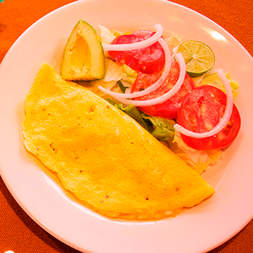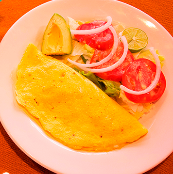 Rico omelette con queso tipo Oaxaca y jamón acompañado de ensalada mixta y aguacate.
