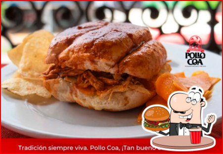 1 pollo Coa asado al carbón , acompañado con papas fritas, ensalada de zanahoria en vinagre y chiles jalapeños en rajas 3 piezas de pan salsa roja y verde y un pan