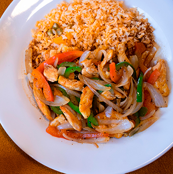 200 g de Pechuga de pollo fileteada sazonada con pimiento y cebolla acompañadas con sopa de arroz a la mexicana.
