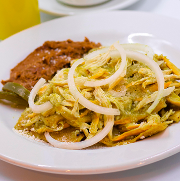 Totopos de maíz bañados en salsa de tomate con pollo cocido, cebolla, queso seco, acompañado de frijoles refritos y chiles en vinagre
