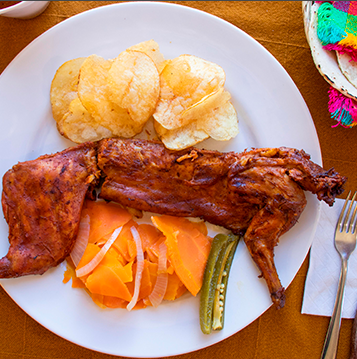 1 pollo Coa asado al carbón , acompañado con papas fritas, ensalada de zanahoria en vinagre y chiles jalapeños en rajas , diez tortilla hechas a mano y salsa roja y verde