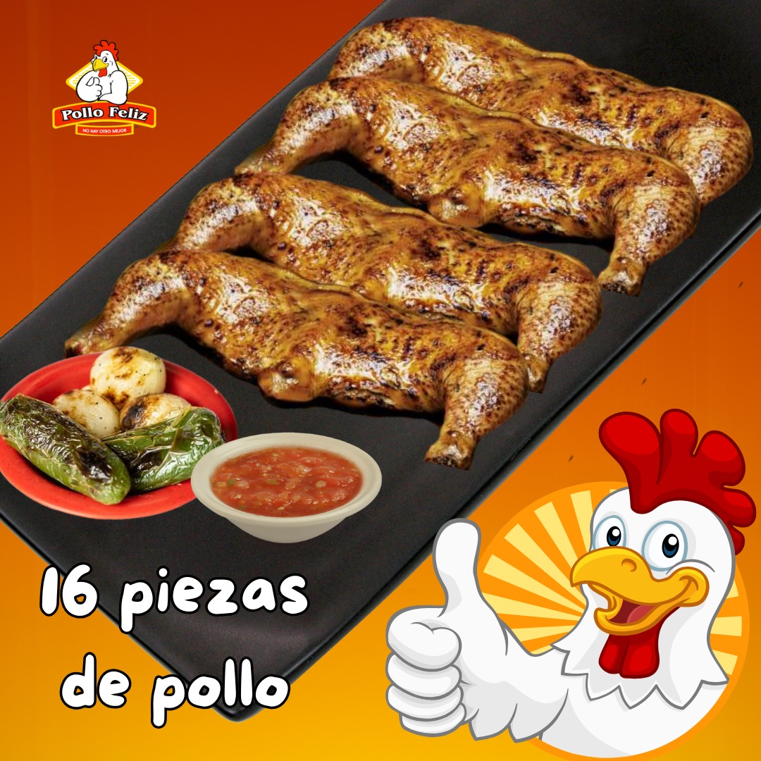 16 piezas 8 Piernas 8 muslos. Incluye salsa, tortillas hechas a mano, chiles, cebolla asada y totopos, 1 salsa, 2 tortillas, 1 chile asado.