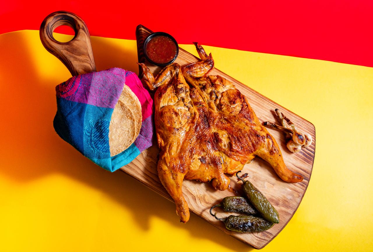 Pollo Asado al Carbón Enchilado. Incluye 8 tortillas hechas a mano, 90 gr de totopos, salsa de la casa, chiles y cebollas asados al carbón.