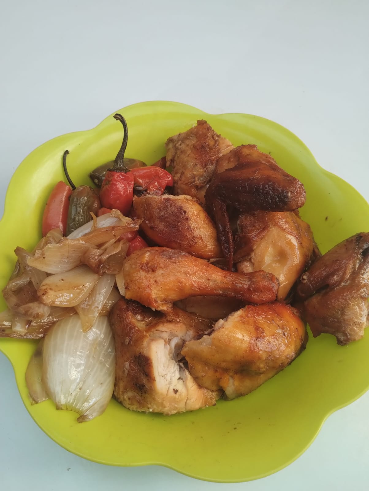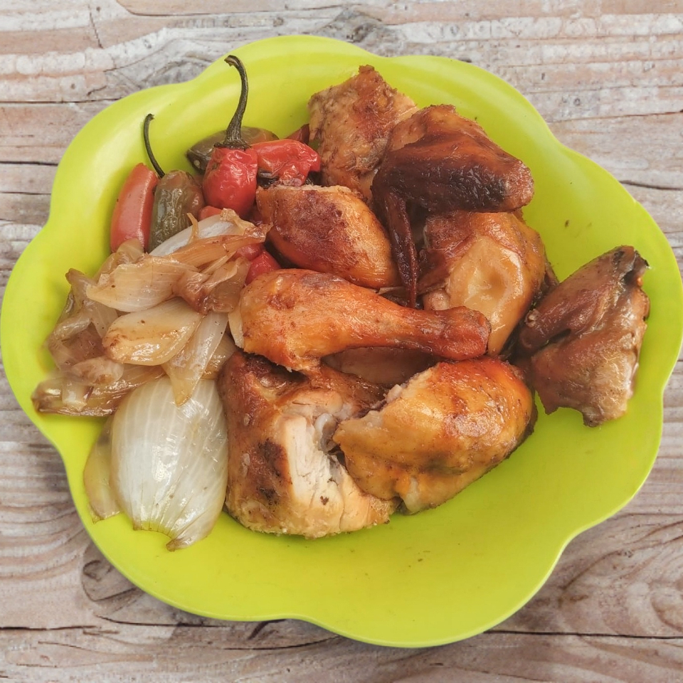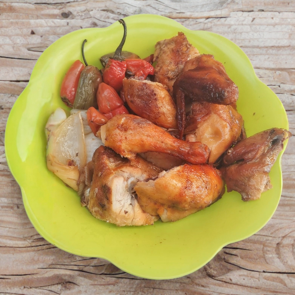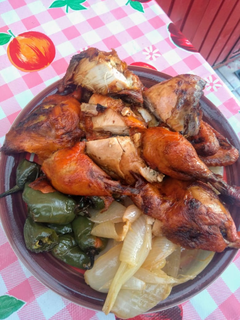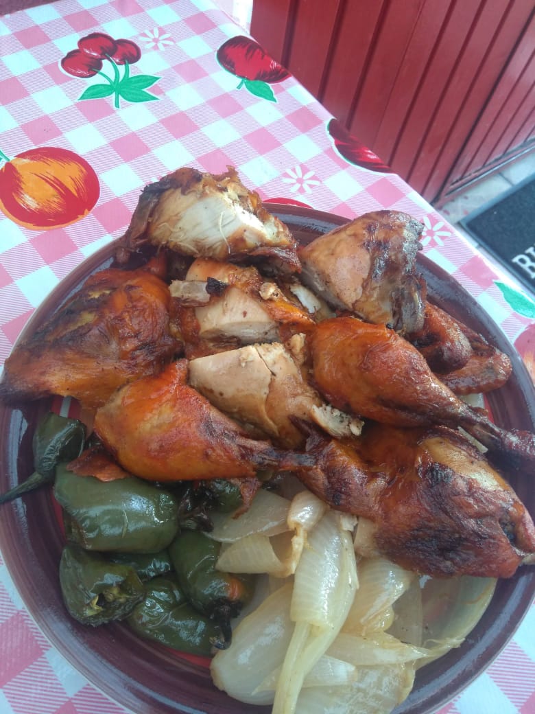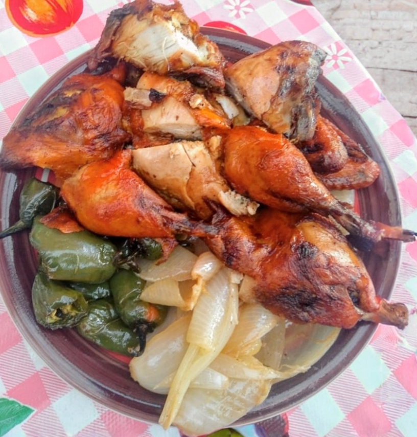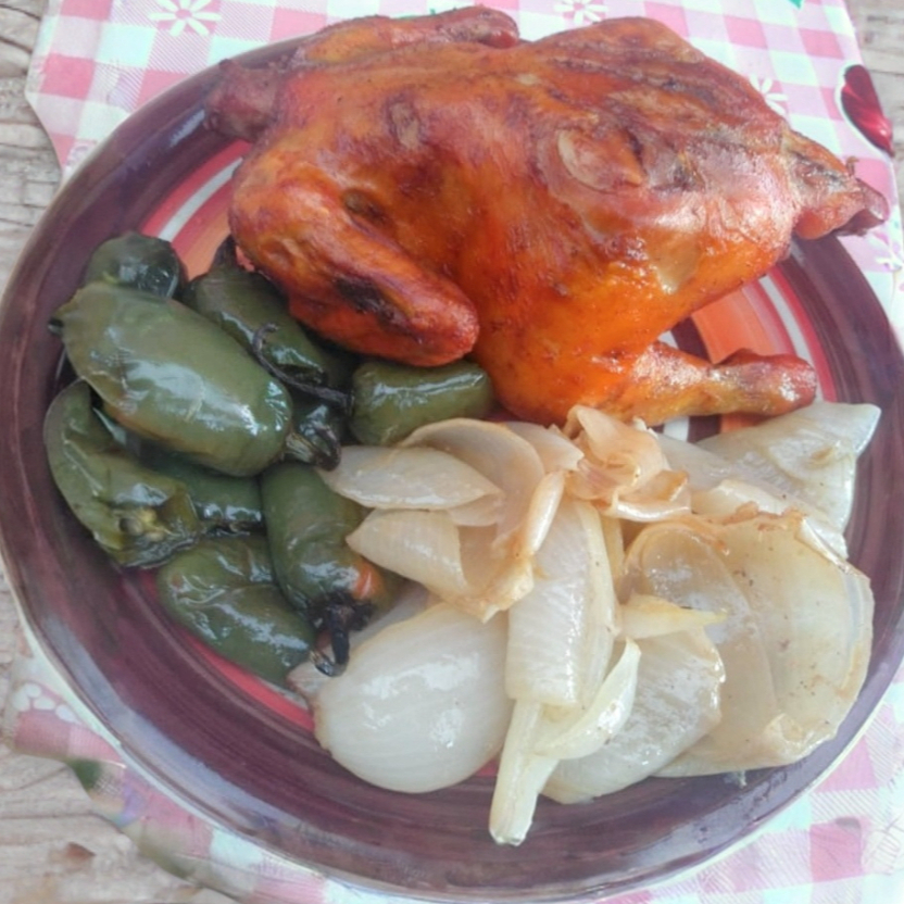 1 Pollo completo (10 piezas), acompañado de chiles asados, cebollitas asadas y salsa picante. (Combo familiar)