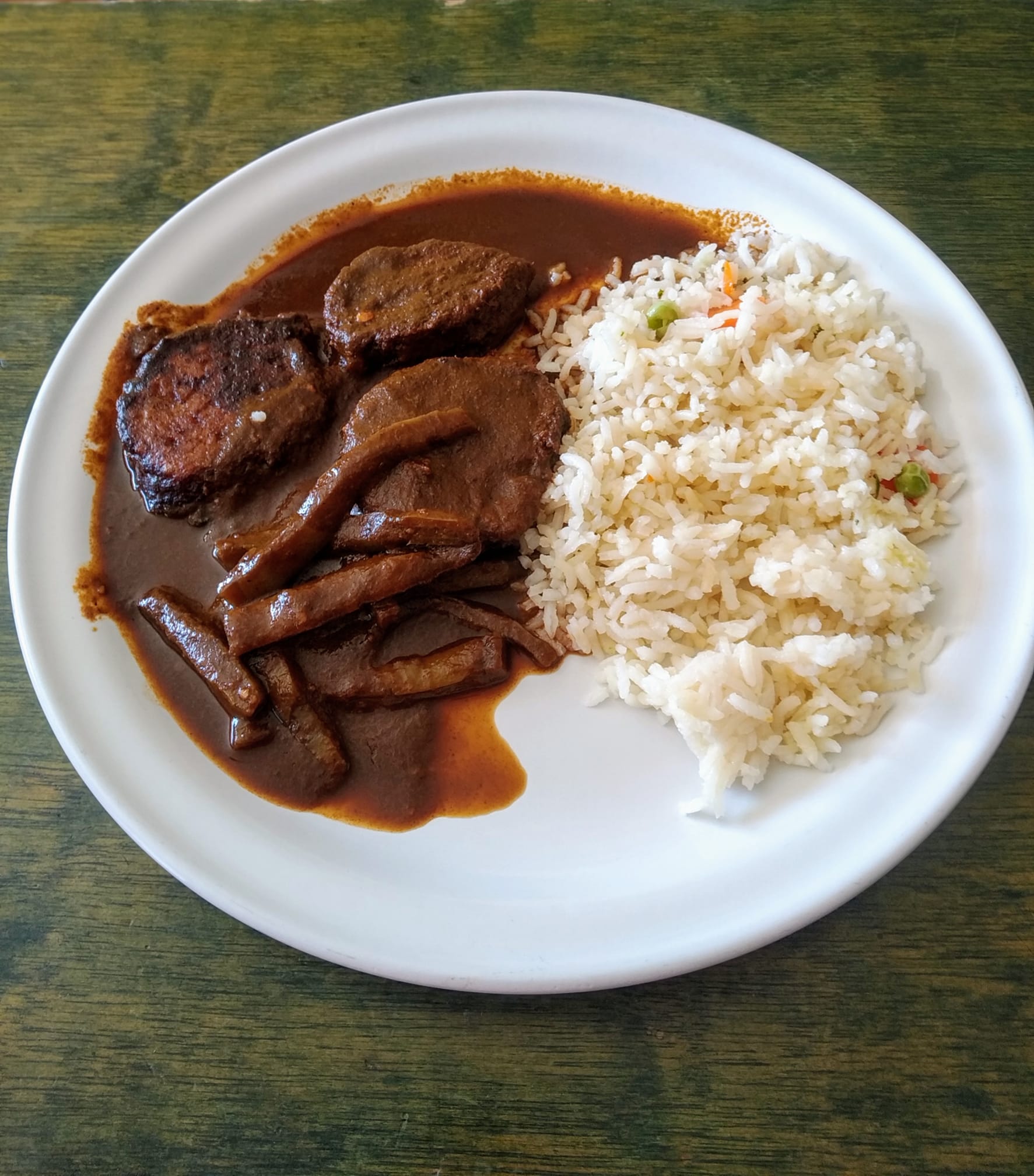 Un delicioso pollo cocido al vapor adobada con nopales.