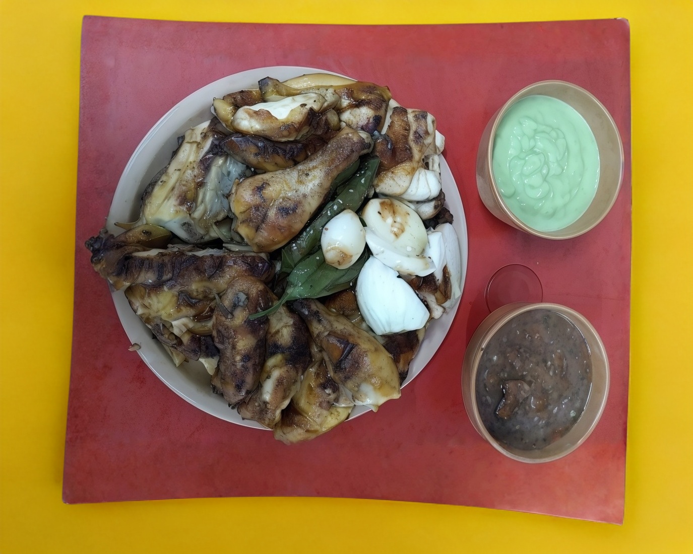 1/2 pollo a la BBQ acompañado de salsa, chile, cebollita y tortillas