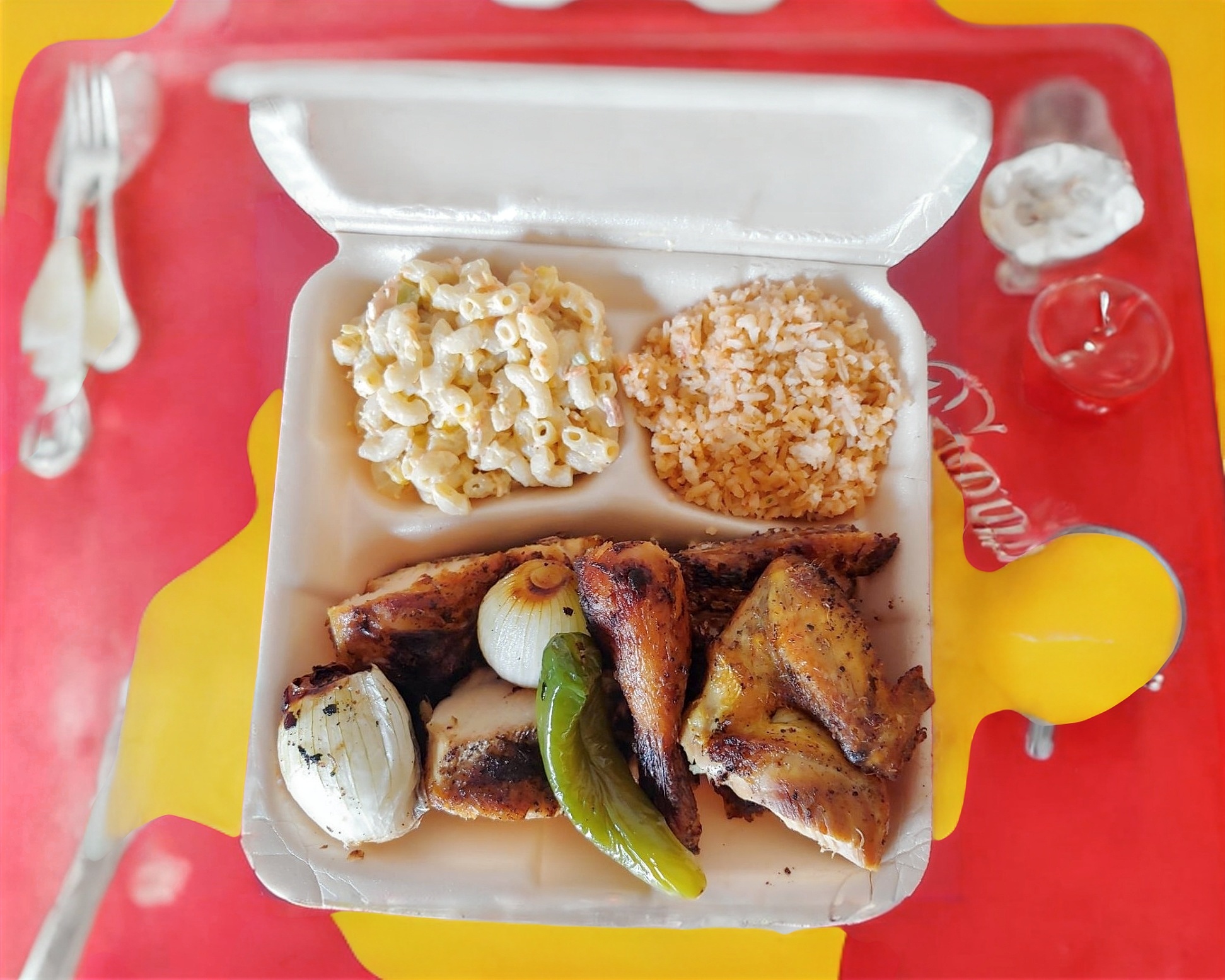 1/2 pollo incluye,250gramos de arroz y 250 gramos de sopa fria