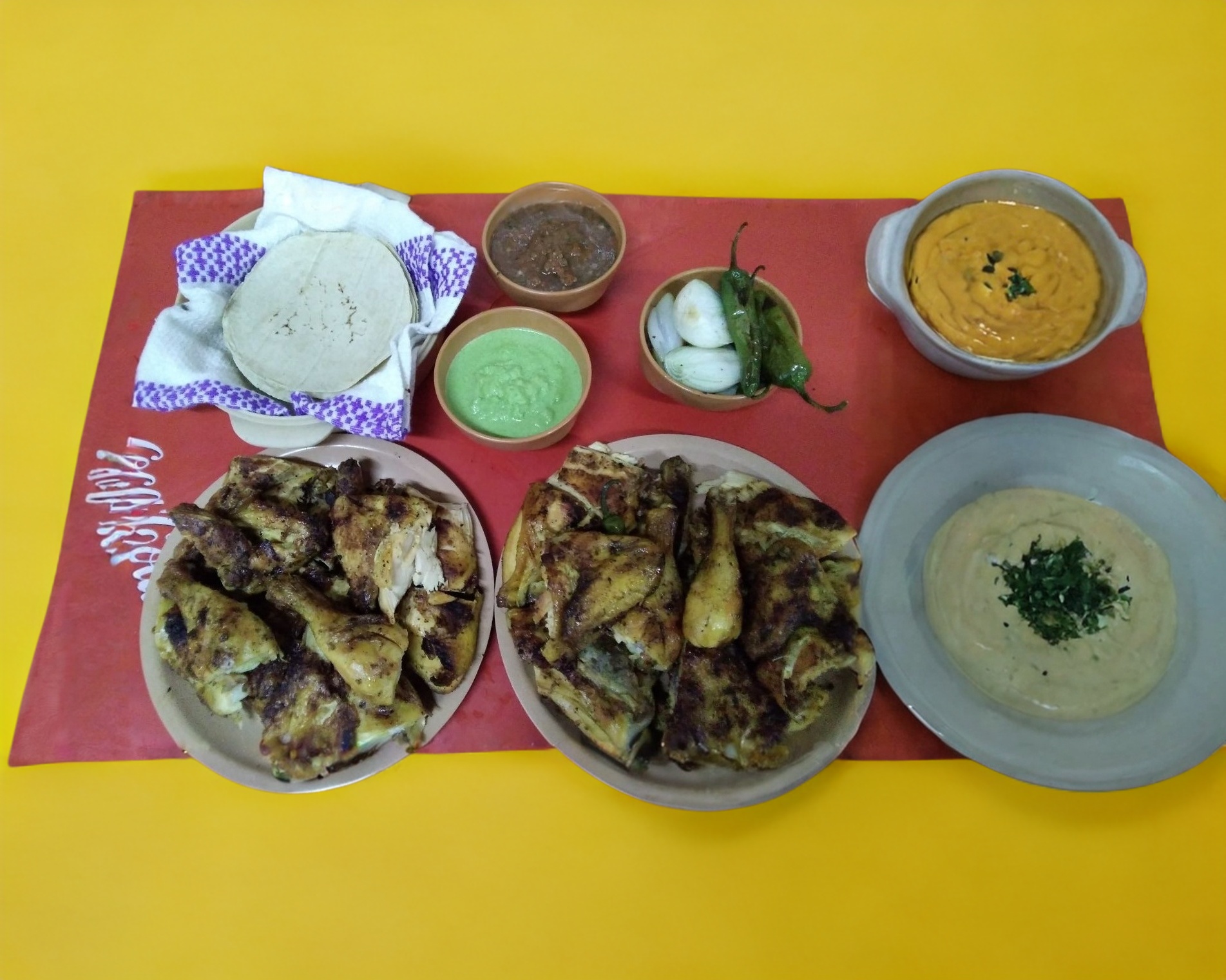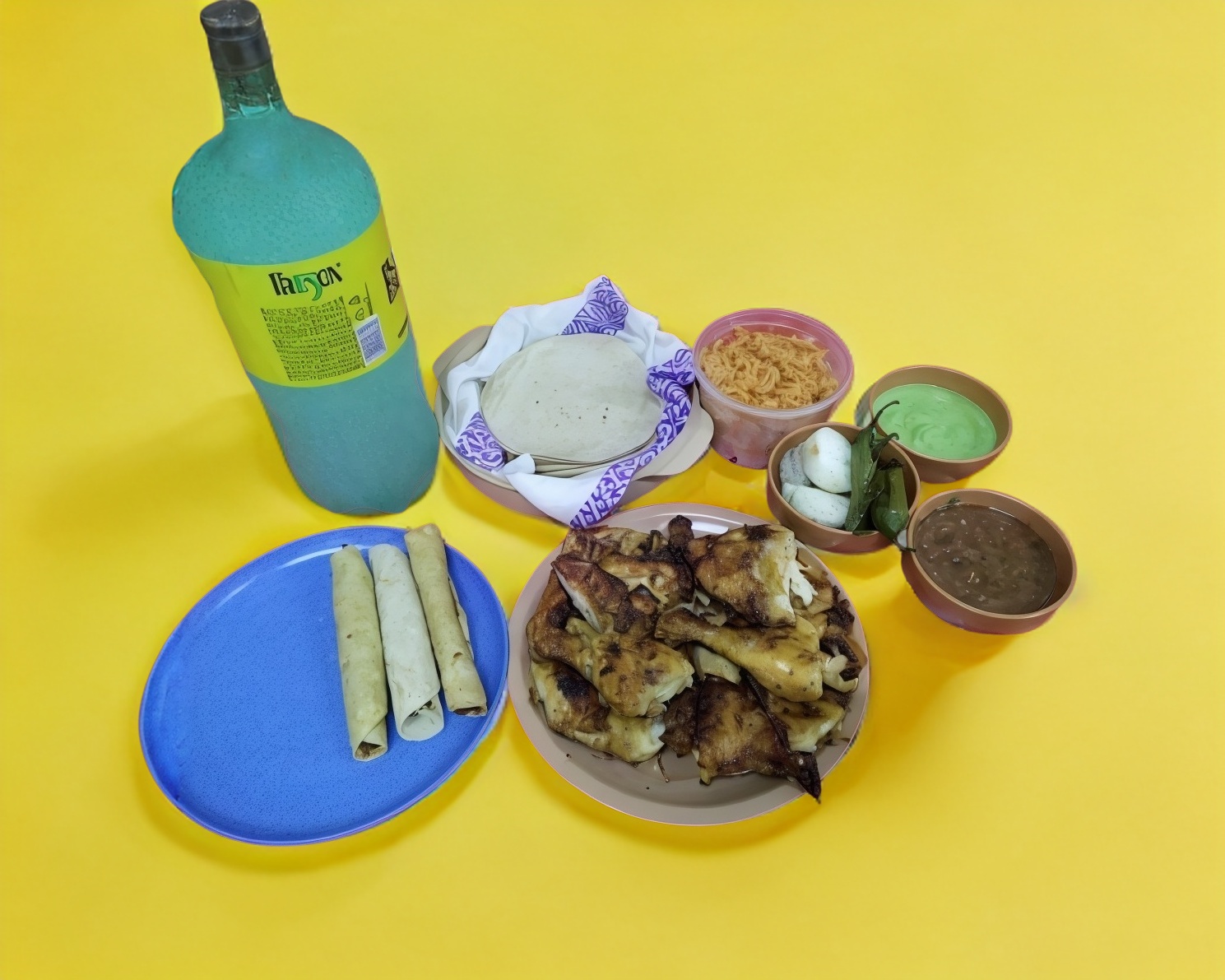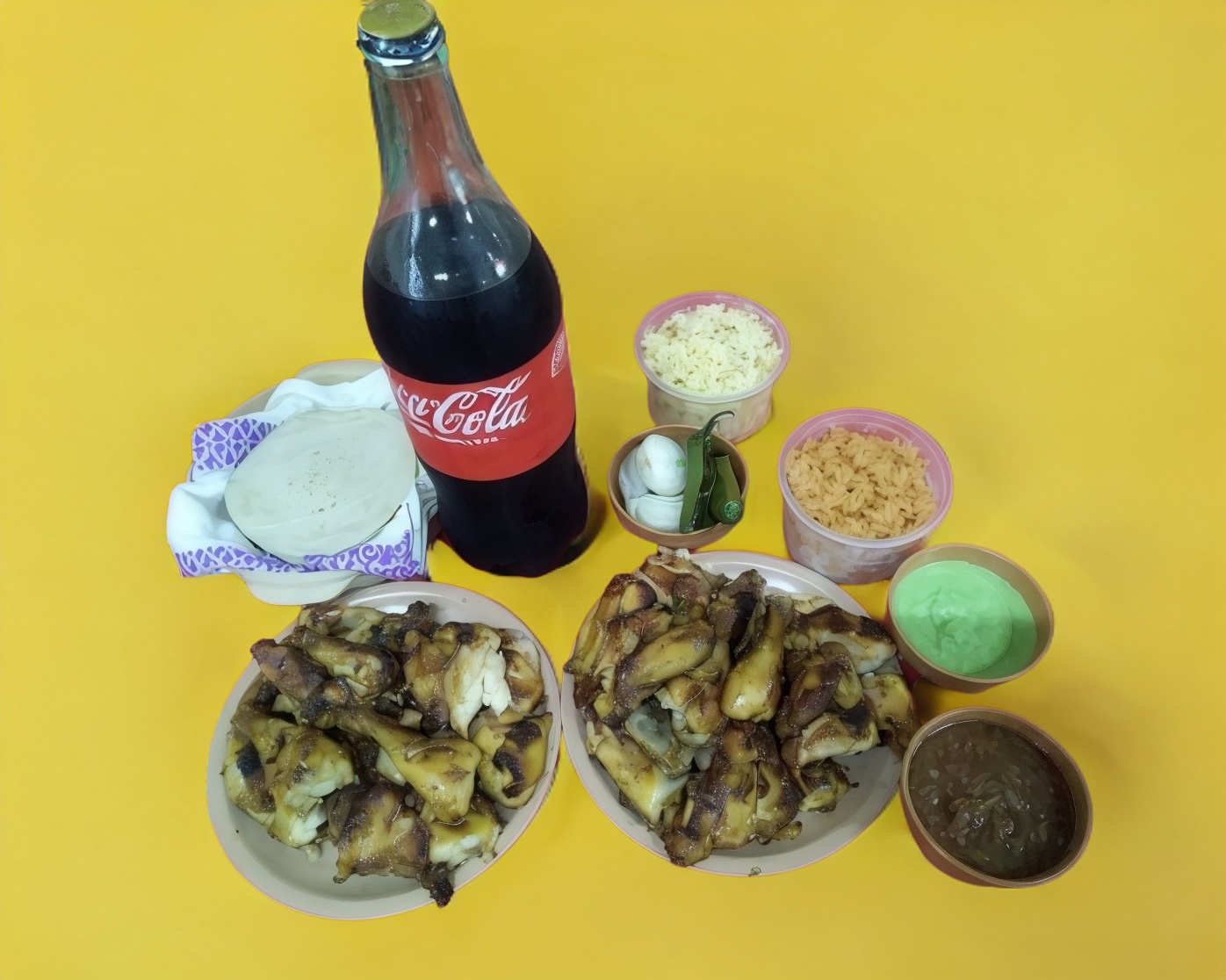 1 y 1/2 pollo, 1 refresco 2 litros de sabor, chile asado, cebollitas asada, tortilla, salsa roja y verde.