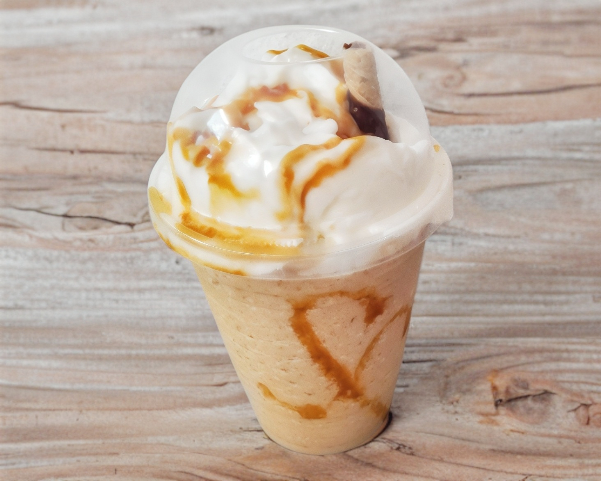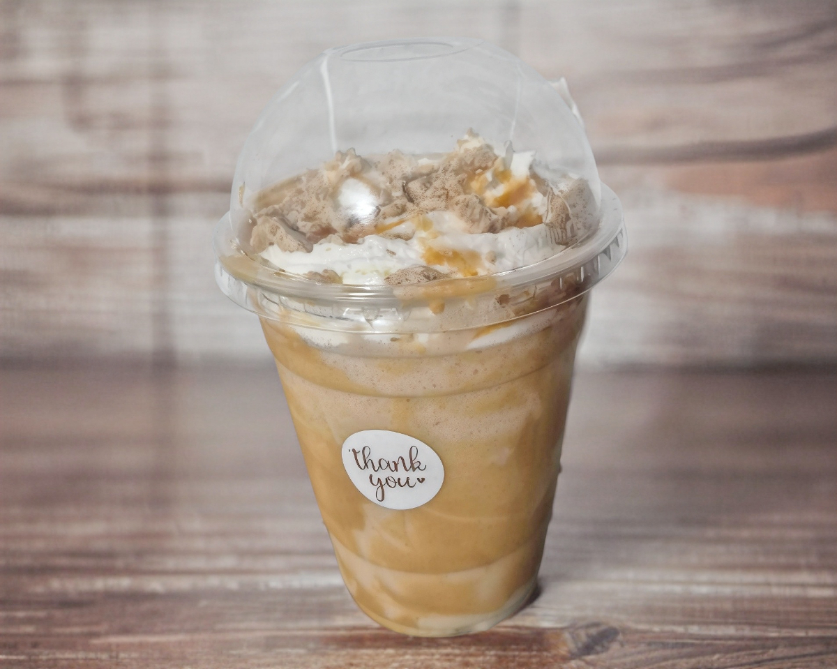 Frappe realizado a base de leche, café y caramelo líquido, acompañado de crema batida, liquido de caramelo y una galleta en forma de barquillo con relleno sabor cappuccino.