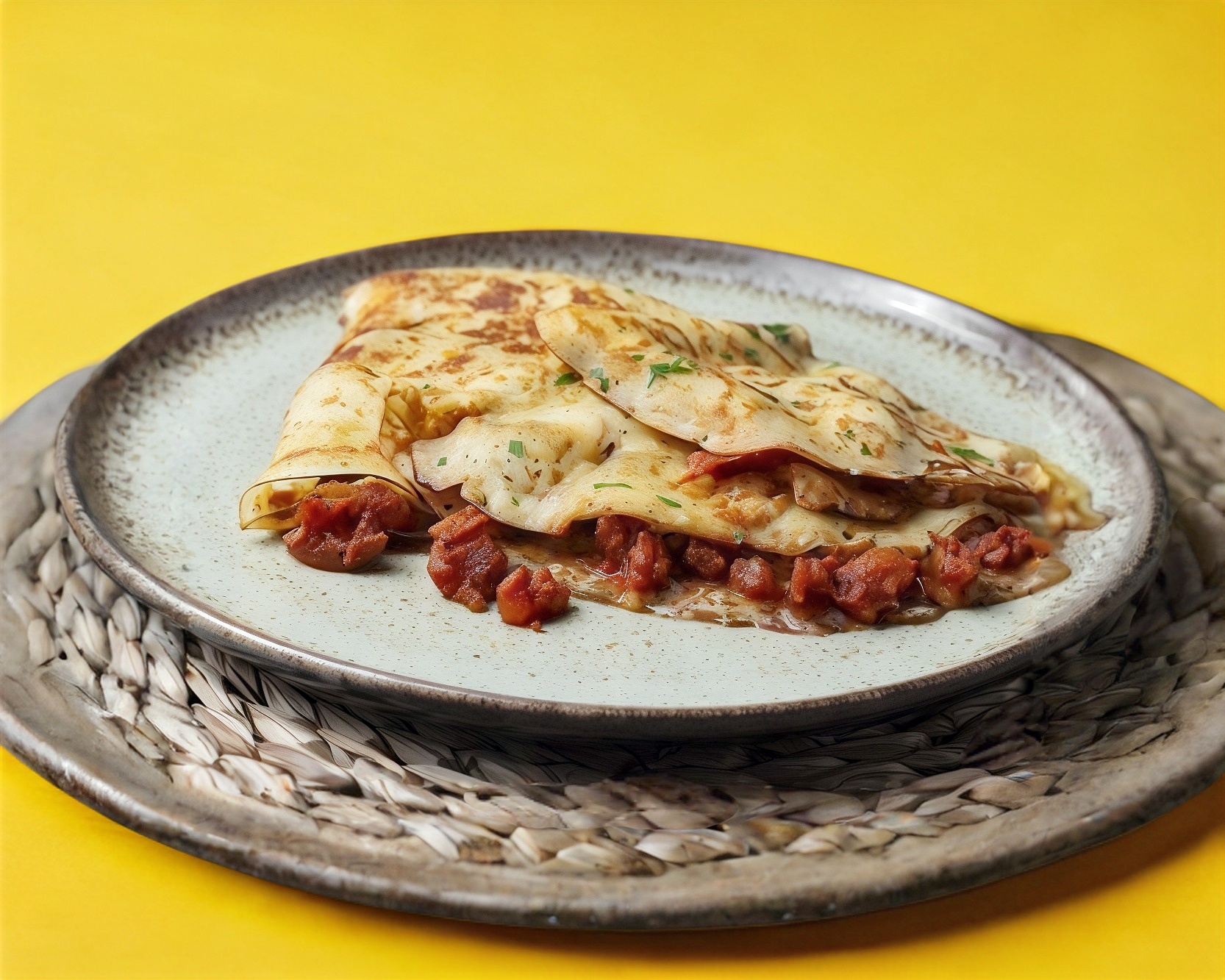 CREPA ELABORADA A BASE DE HARINA DE TRIGO, RELLENA DE QUESO MANCHEGO CON TINGA (NIVEL DE PICANTE MEDIO)