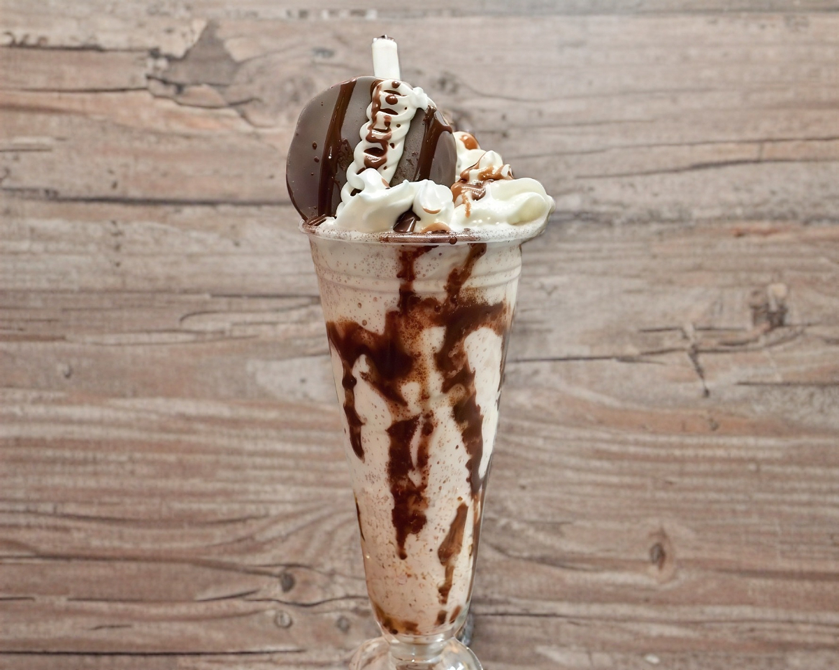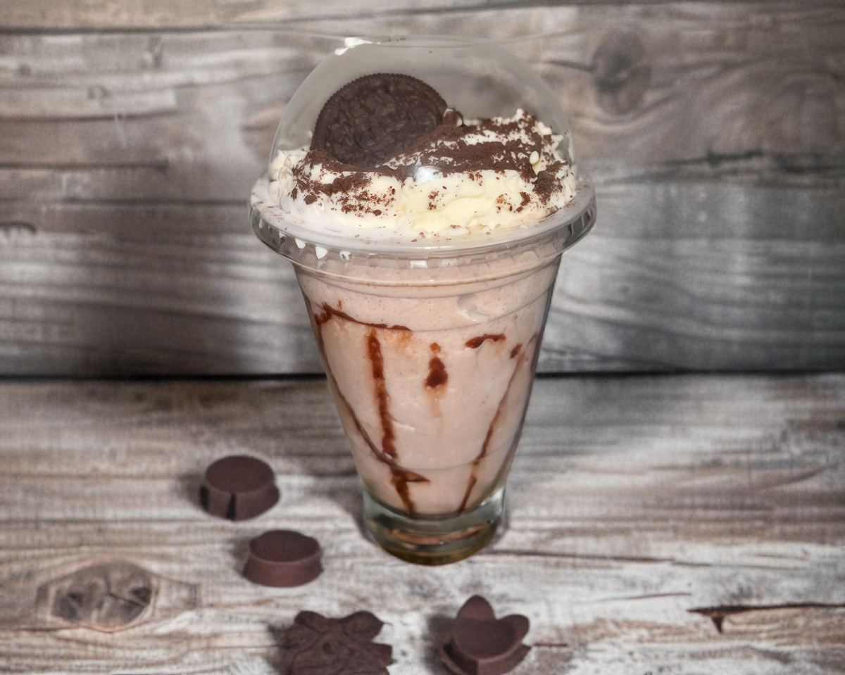 Frappe realizado a base de leche y un pingüino,servido en vaso de 12 onzas escarchado con chocolate herseys ,adornado con crema batida, y trozos de pingüino.