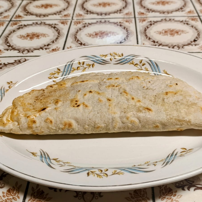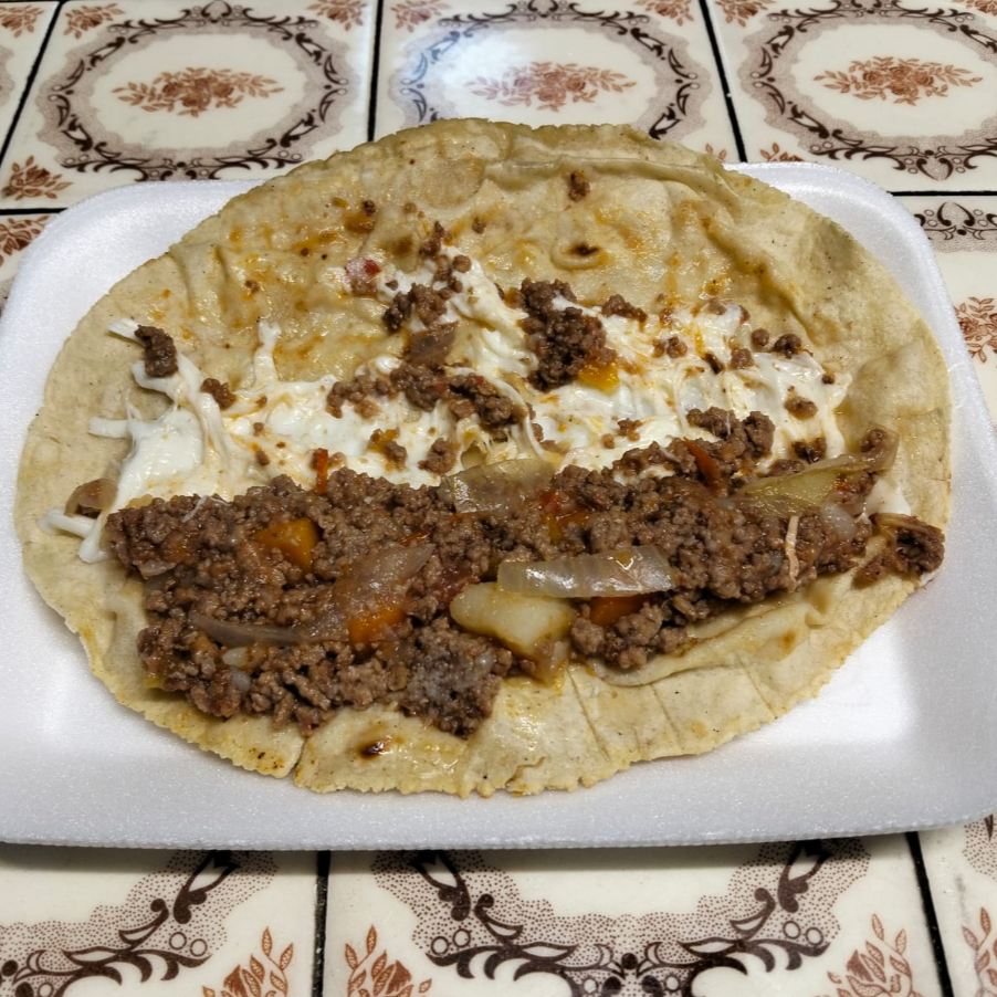Quesadilla de maíz hecha a mano con guisado y salsa roja.