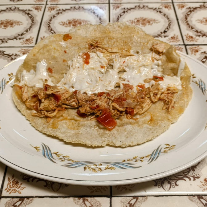 Quesadilla con tortilla de maíz hecha a mano ,guisado de pollo deshebrado con jitomate y cebolla y salsa roja.