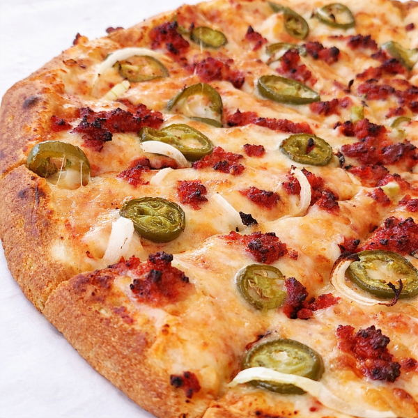 Pizza de 35 cm con salsa pomodoro, mezcla de quesos, chorizo, cebolla y jalapeño. Foto creada con AI.