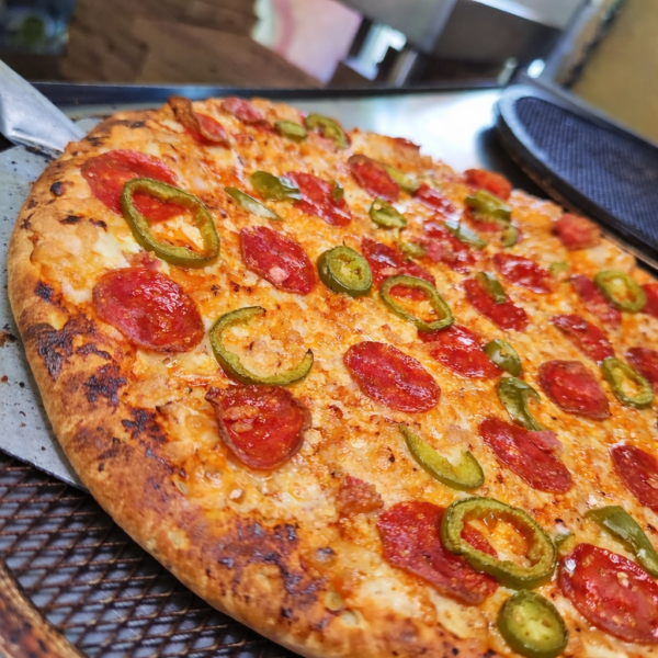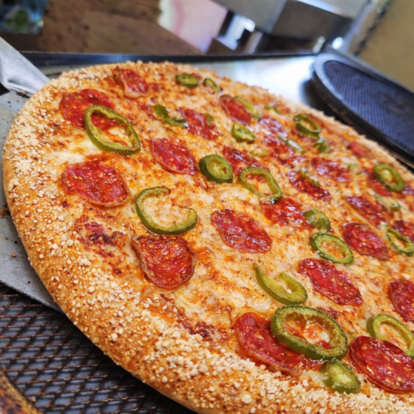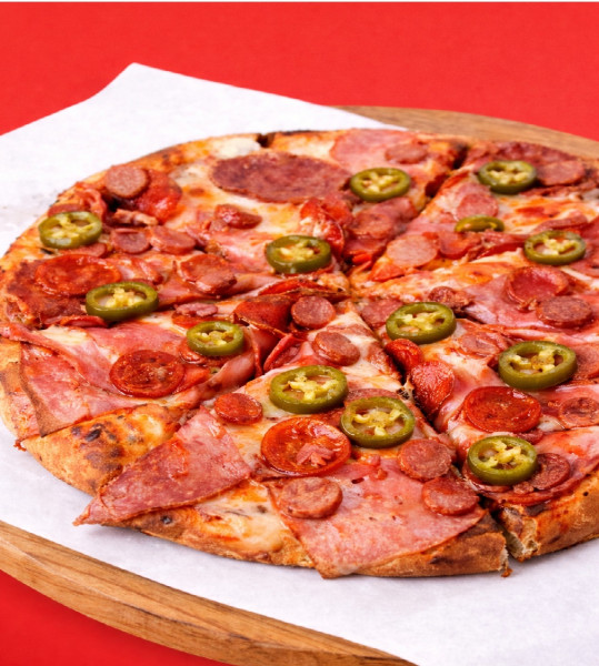 Pizza de 35 cm con salsa pomodoro, mezcla de quesos, pepperoni, jalapeño y tocino.