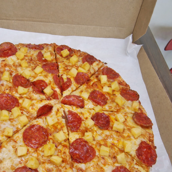 Pizza 35 cm de 8 rebanadas con salsa pomodoro, mezcla de quesos, pepperoni y piña. Foto creada con AI.