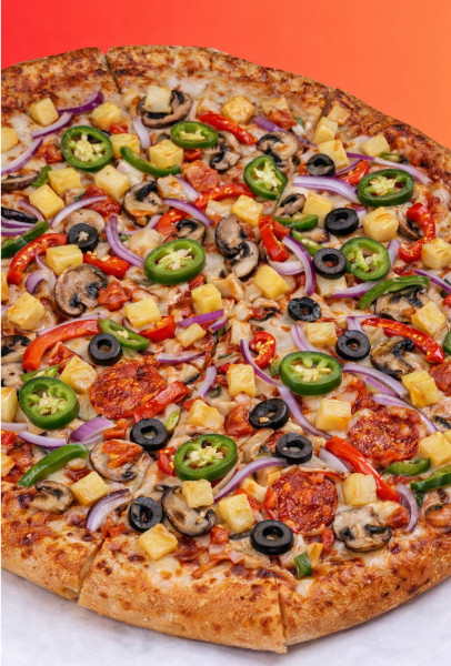 Pizza 35 cm 8 rebanadas con salsa pomodoro, mezcla de quesos y piña, morrón, champiñones, jalapeño, cebolla morada.