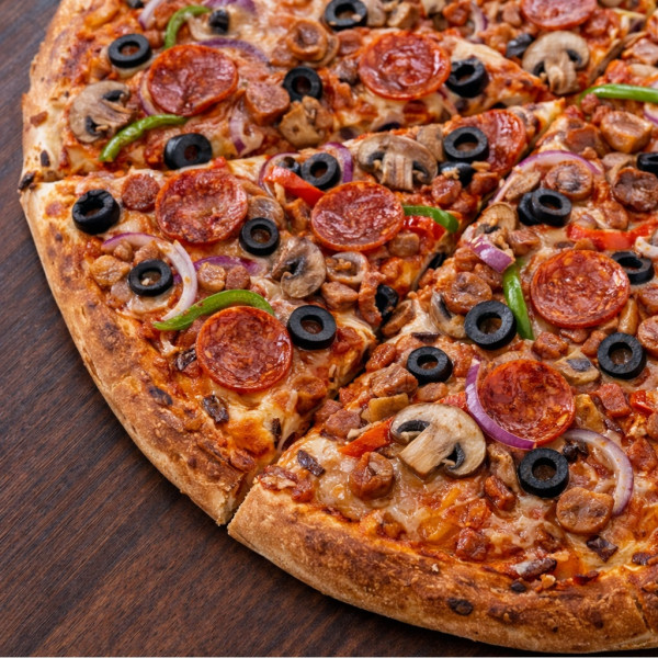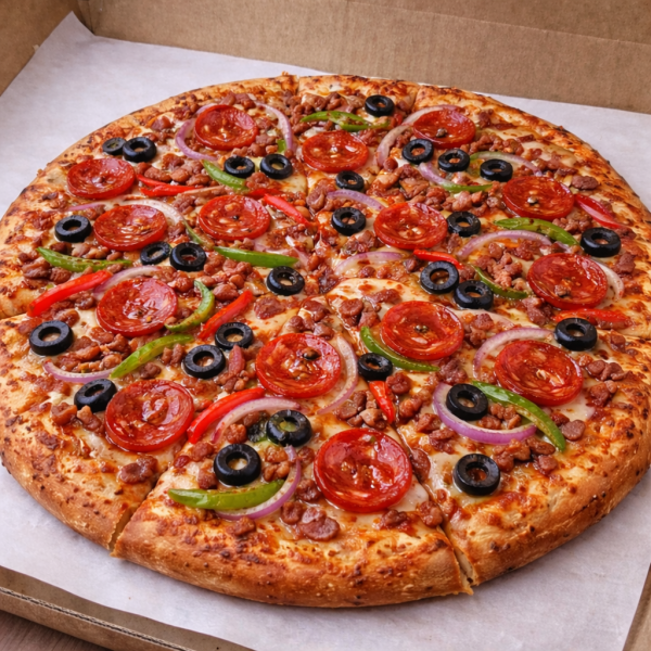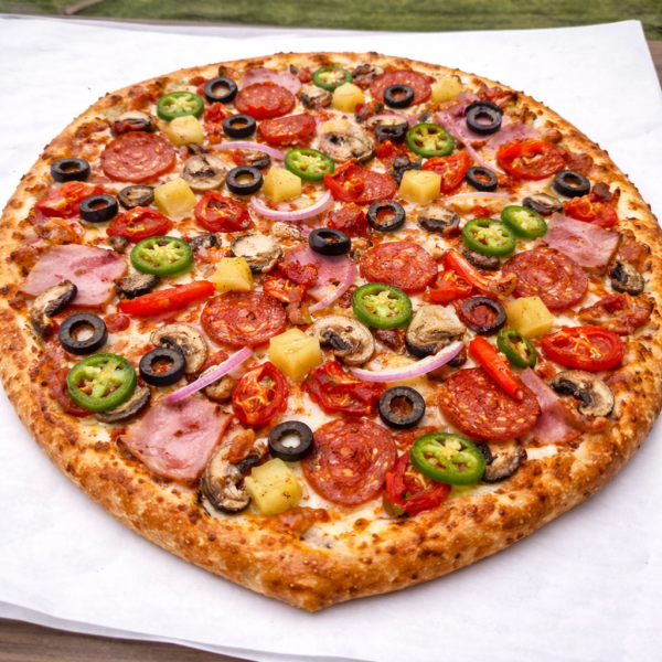 Pizza de 35 cm con salsa pomodoro, mezcla de quesos, pepperoni, salami, salchicha, morrón, aceituna negra, cebolla morada, champiñones.