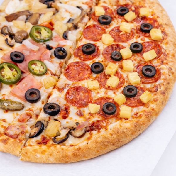 Pizza grande 35 cm de 8 rebanadas con salsa pomodora y mezcla de quesos con la especialidades que tú elijas mitad y mitad.