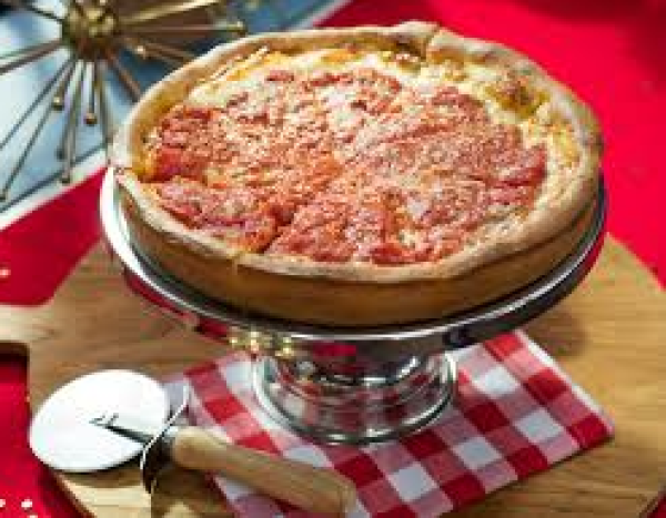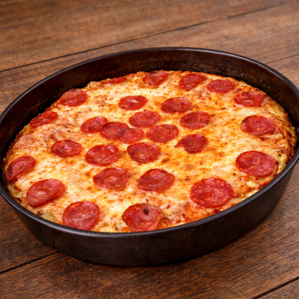 Pizza de 32 cm estilo chicago rellena de queso, salsa especial y queso parmesano de topping.
