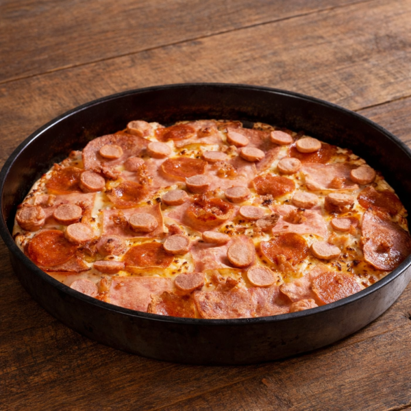 Pizza 35cm de 8 rebanadas pero el doble de masa, con masa especial cacerola, pepperoni, jamón, salami, salchicha, tocino y mucho queso.