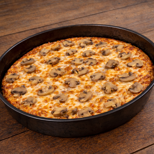Pizza masa cacerola de 35 cm con salsa pomodoro, mucho queso, muchos champiñones. Corte de pizza especial.