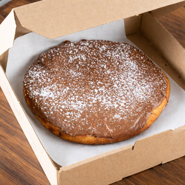 Deliciosa pizza dulce con crema de avellana y azúcar glass.