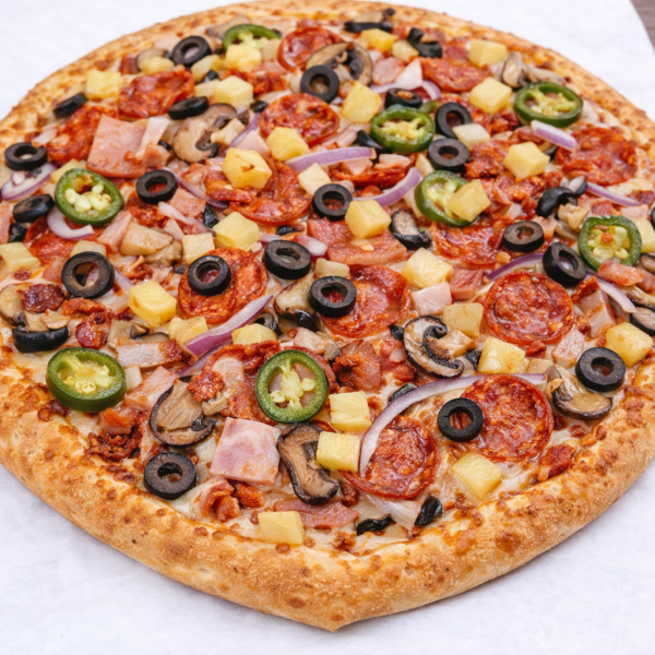 Pizza de 35 cm con salsa pomodoro, mezcla de quesos, pepperoni, jamón, salami, salchicha, chorizo, tocino, jalapeño.