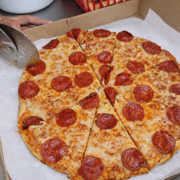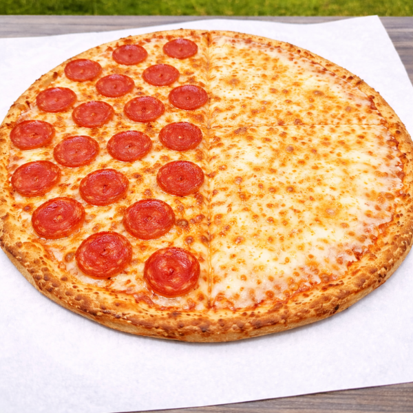 Pizza de 35 cm con salsa pomodoro, mezcla de quesos, mitad queso y mitad pepperoni.