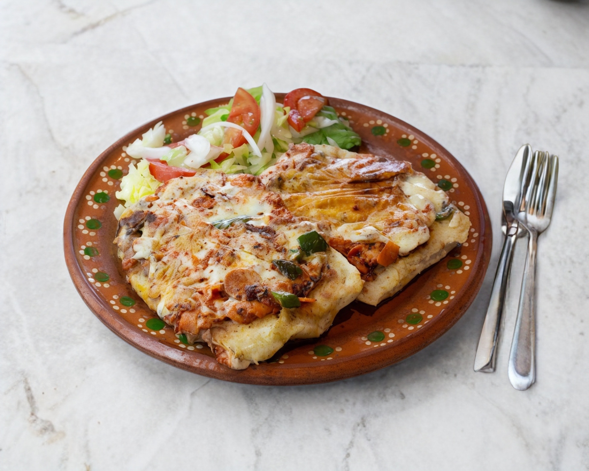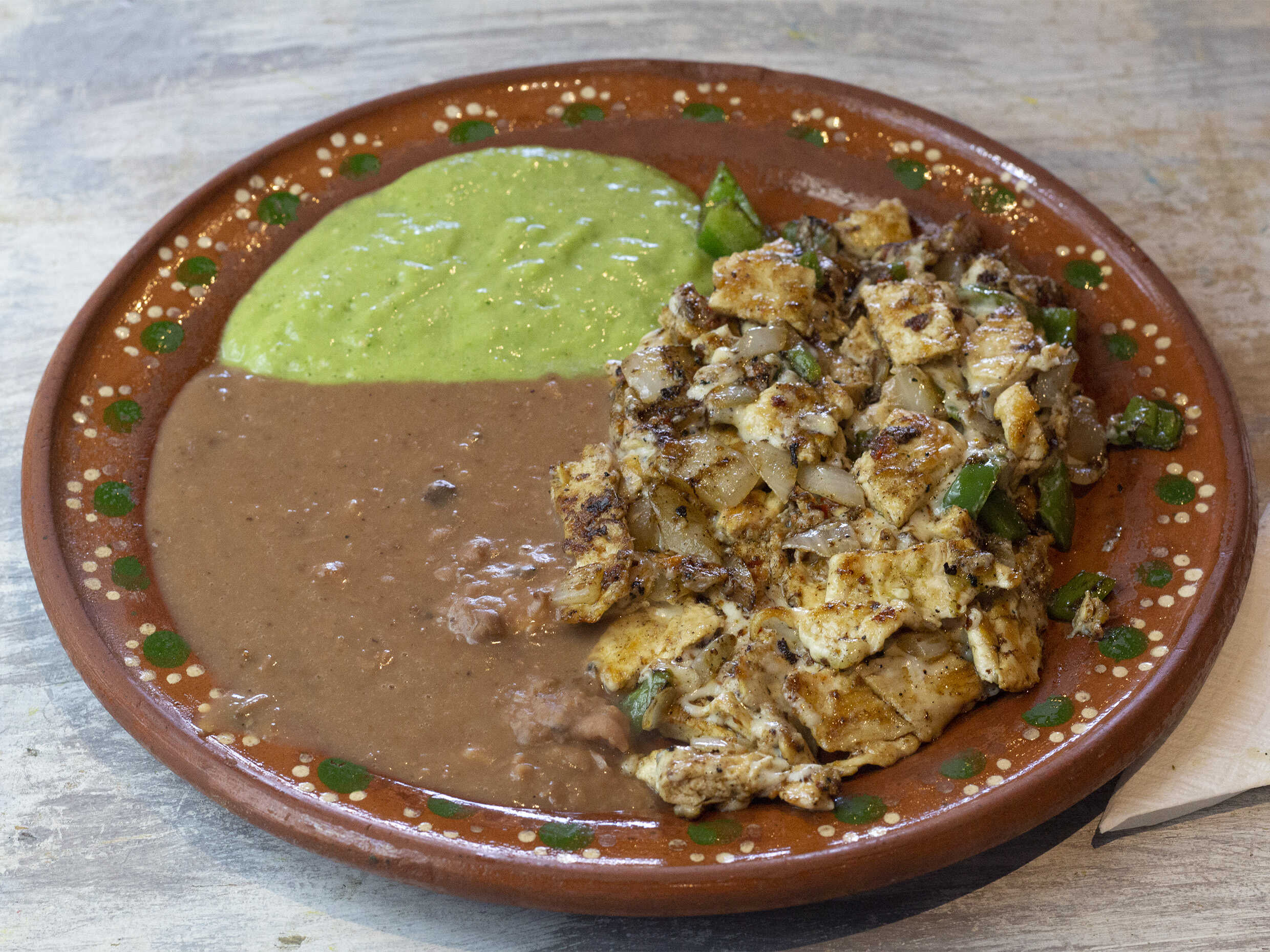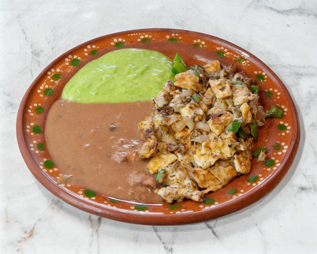 Pechuga de pollo, pimiento, cebolla y queso, acompañado de salsa de aguacate, frijoles y tortillas.