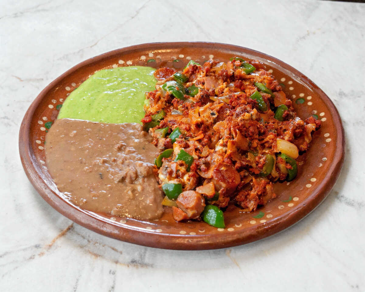Chorizo, pimiento, cebolla y queso, acompañado de salsa de aguacate, frijoles y tortillas.