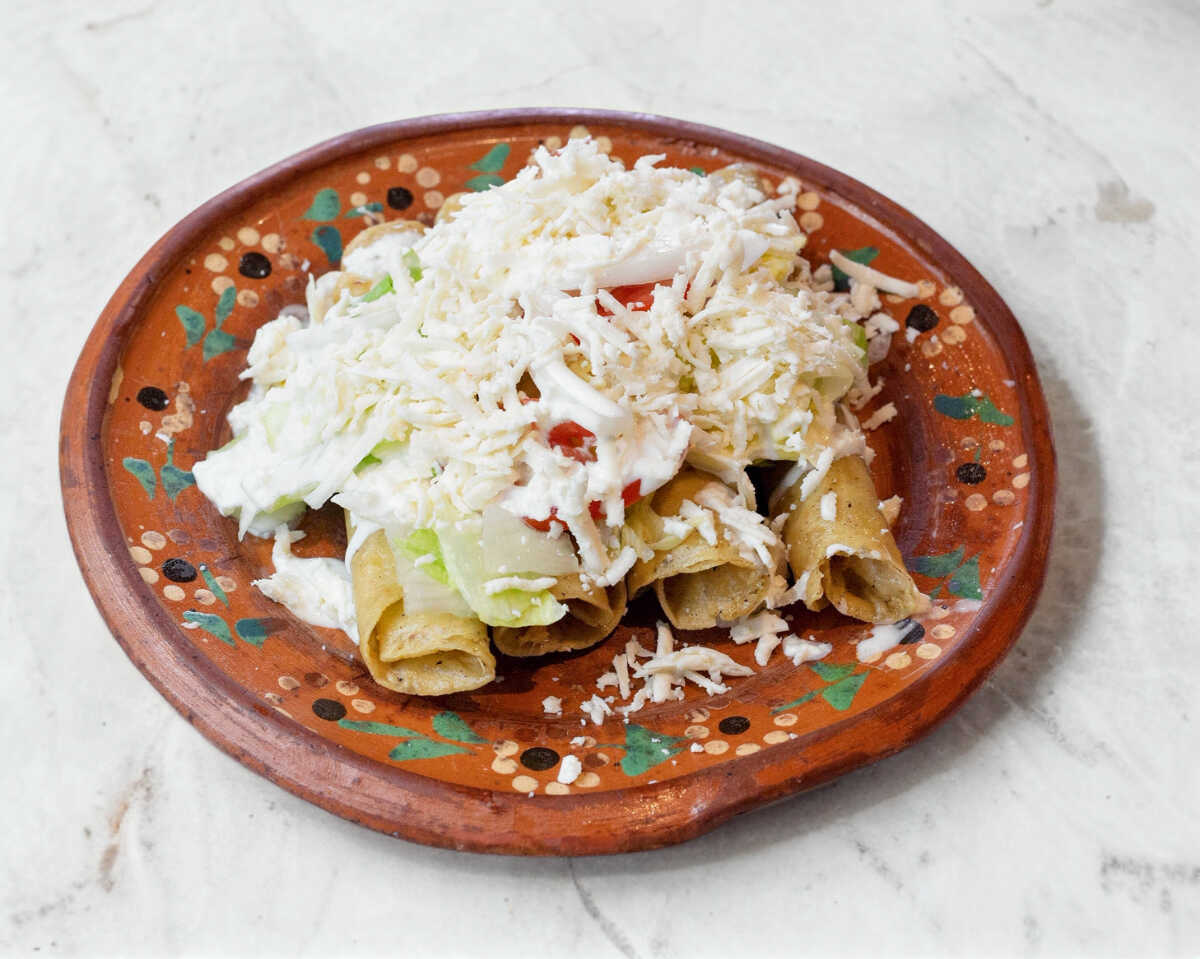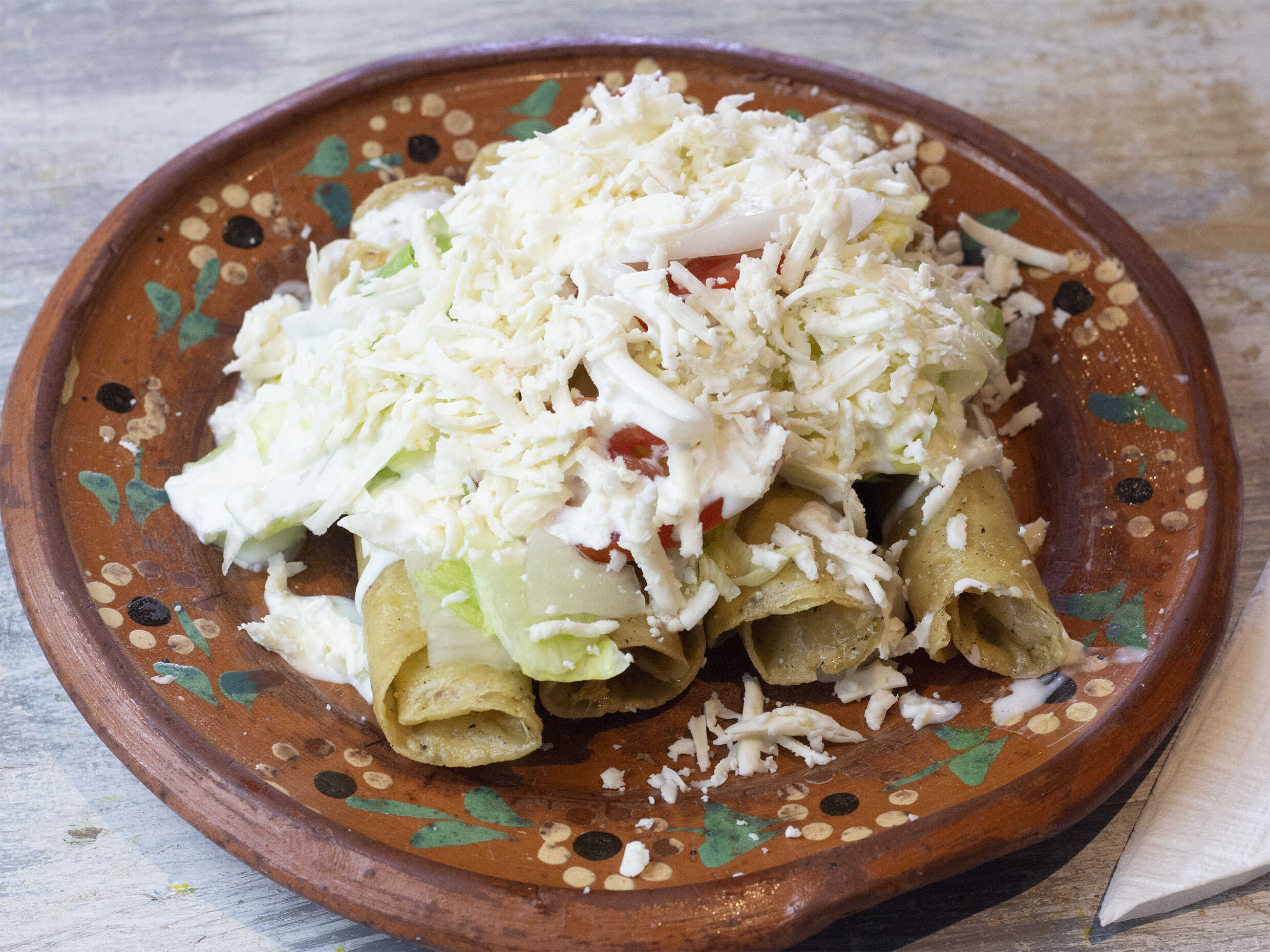 Cuatro tacos, rellenos de pollo, jamón o queso, con lechuga, jitomate, cebolla, crema y queso.