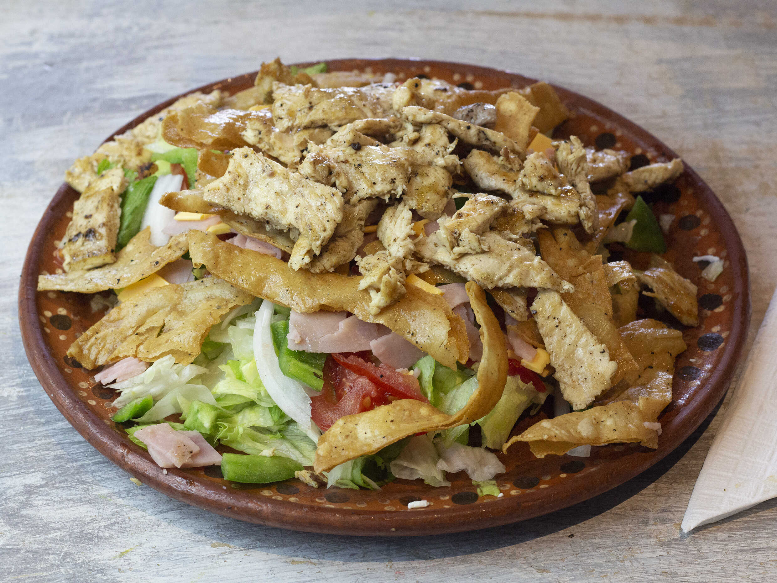 De pechuga de pollo o carne asada con lechuga, jitomate, cebolla, pimiento, jamón, queso amarillo, totopos de maíz y aderezo.