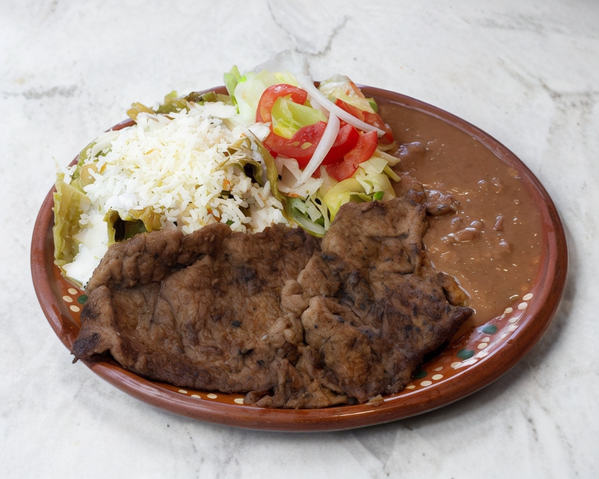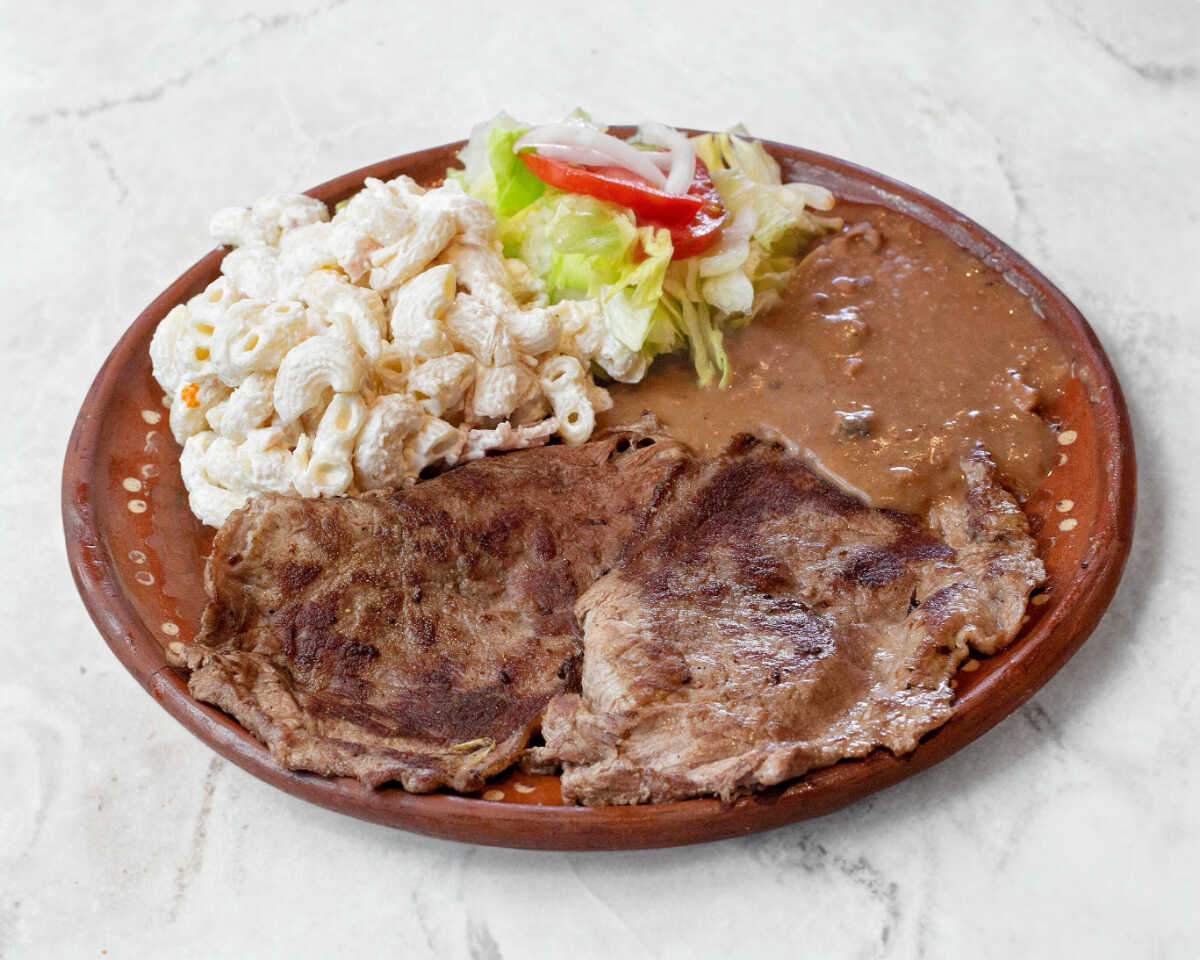 Bistec, pimiento, cebolla y queso, acompañado de salsa de aguacate, frijoles y tortillas.