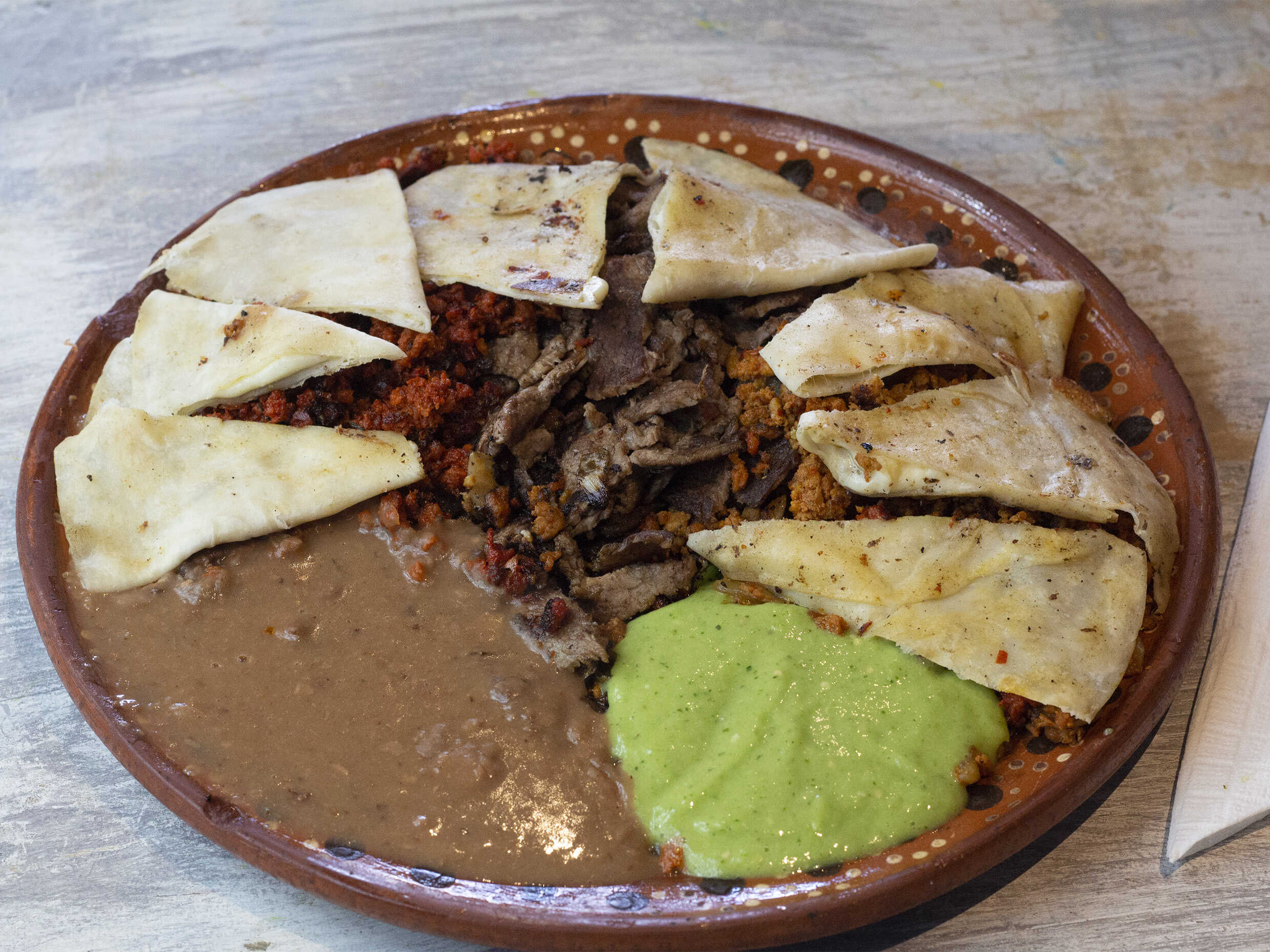 Chorizo, pimiento, cebolla, jamón, salchicha y queso, acompañado de frijoles, salsa de aguacate y tortillas.