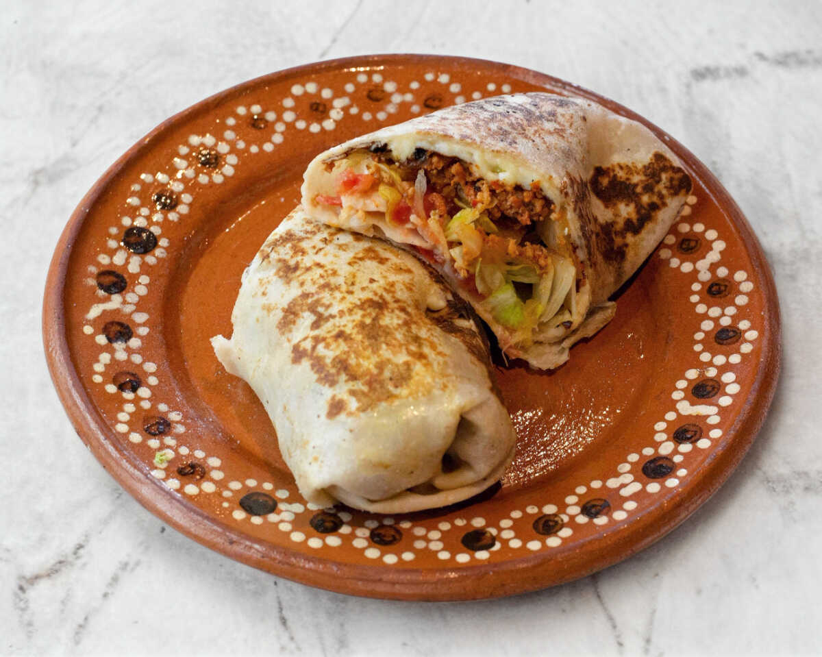 Pastor, cebolla, pimiento y queso, acompañado de salsa de aguacate, frijoles y tortillas.