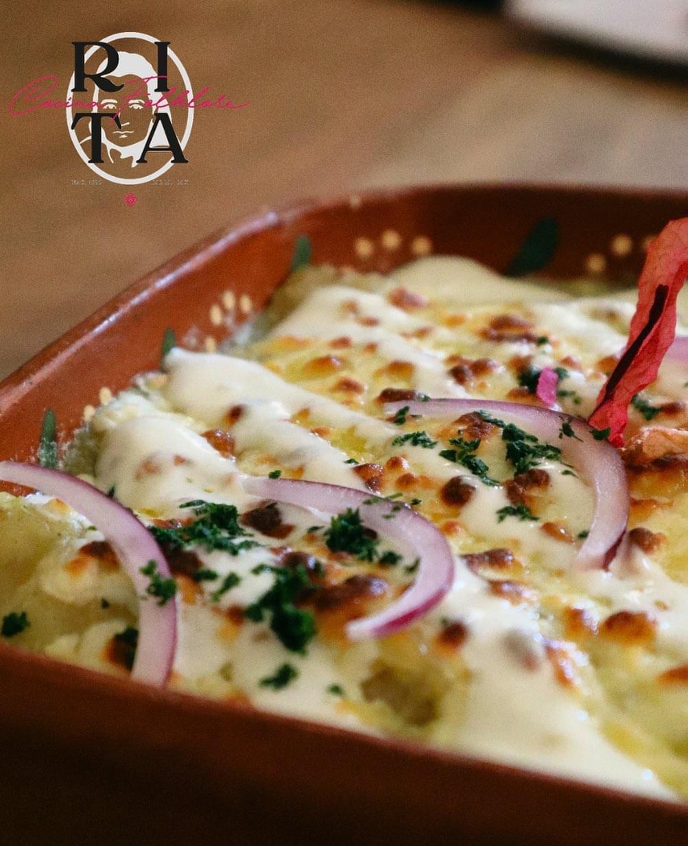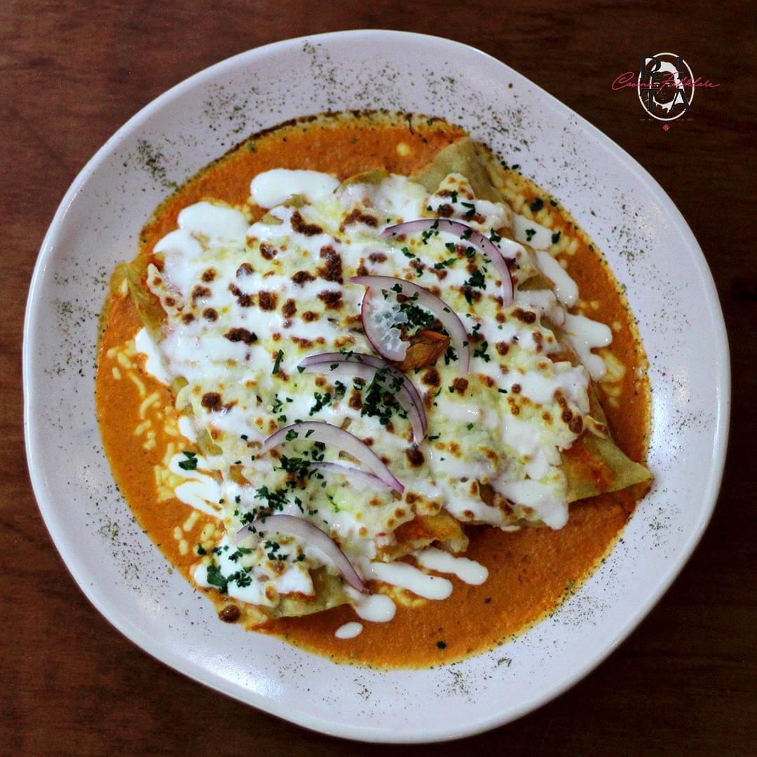 En salsa cremosa de jitomate, gratinadas, rellenas de pollo, servidas con crema y cebolla morada