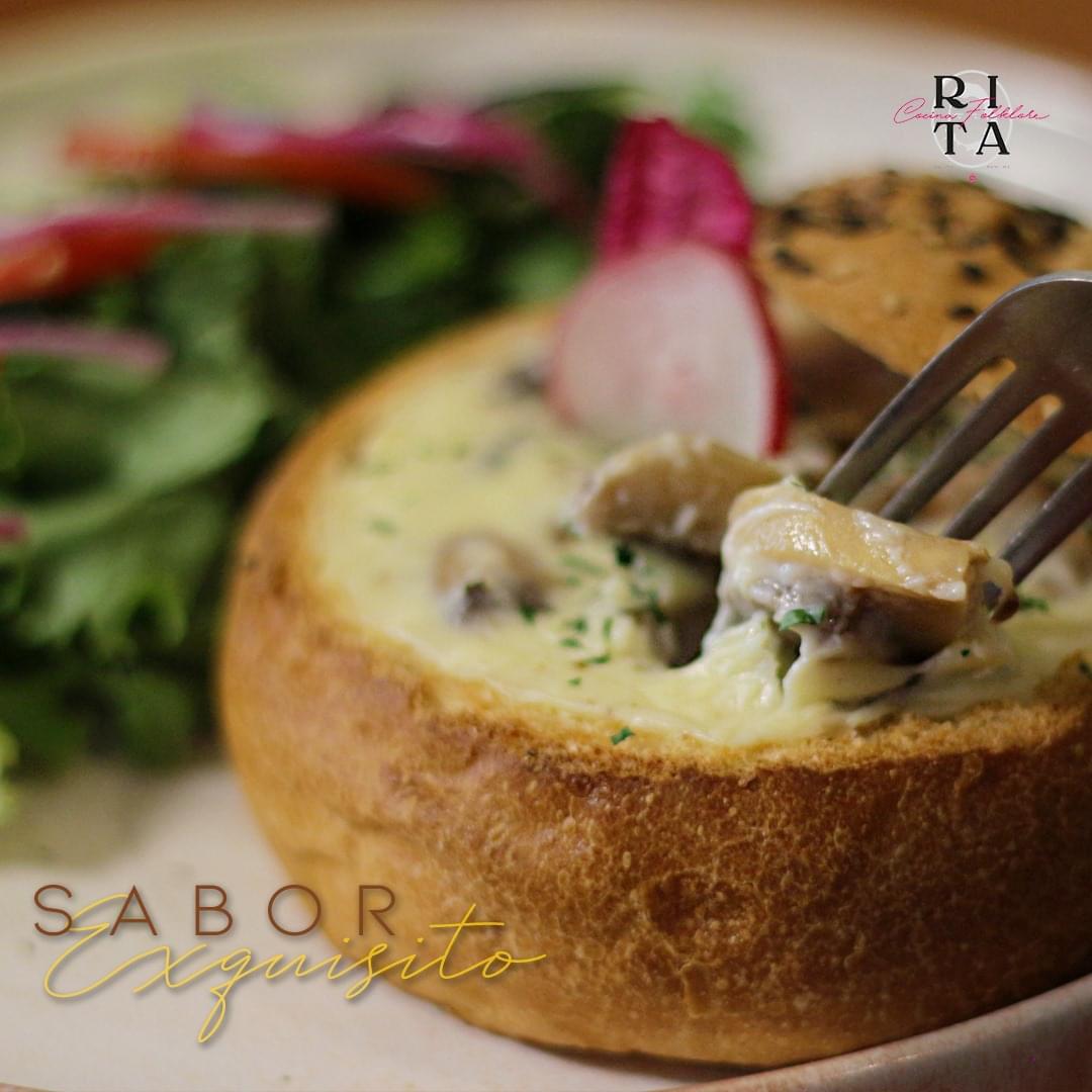 Queso fundido con champiñones servido dentro de un pan artesanal acompañado de ensalada.