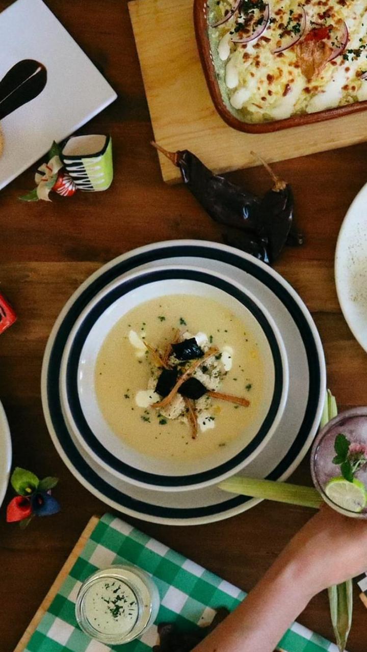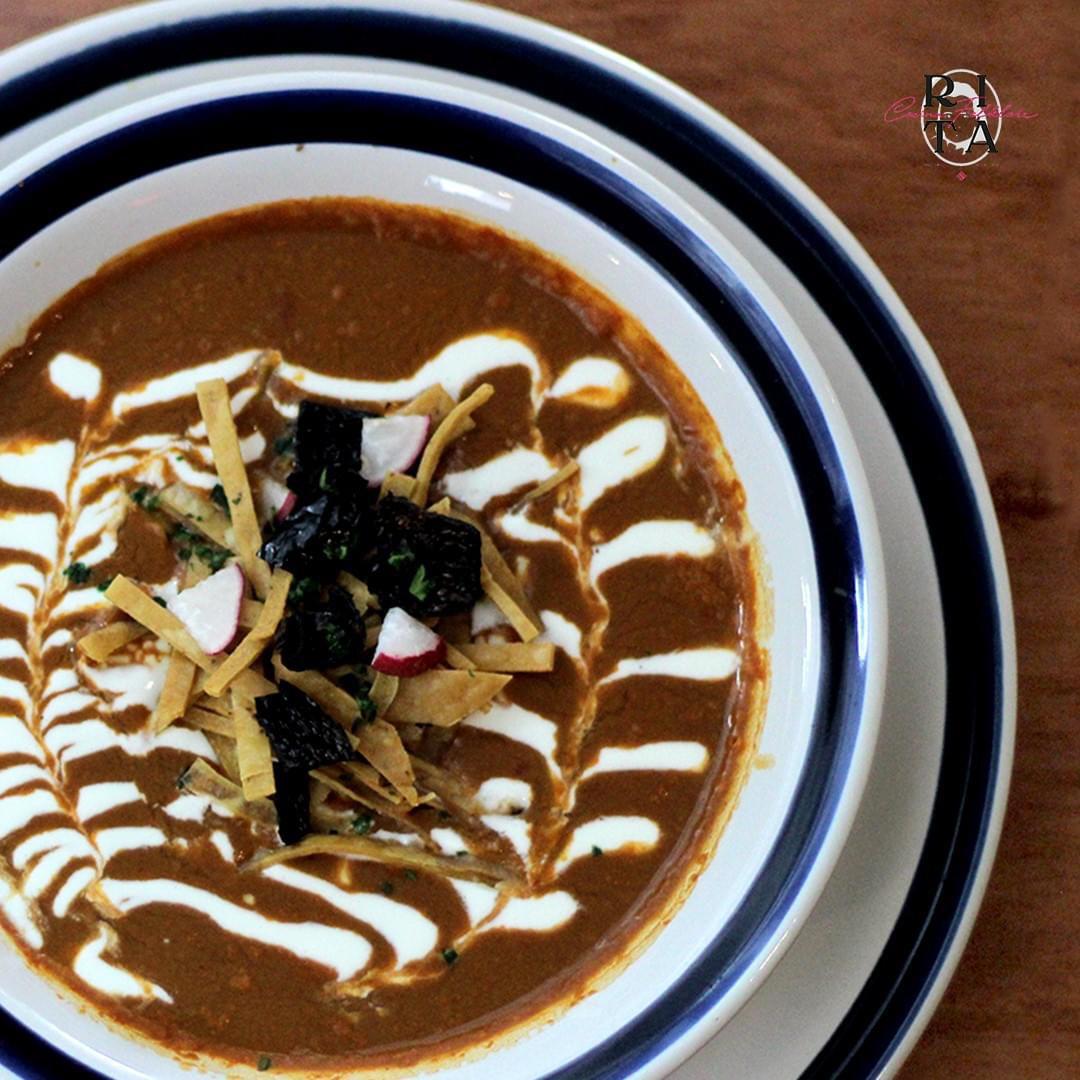 Sopa de frijol y chile guajillo servida con crema, queso asadero fundido, pequeños tropiezos de tortilla y chile ancho frito.