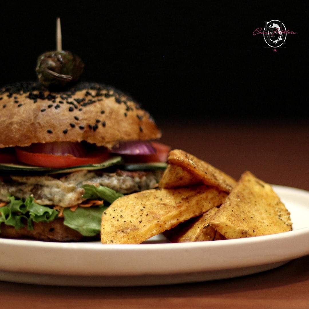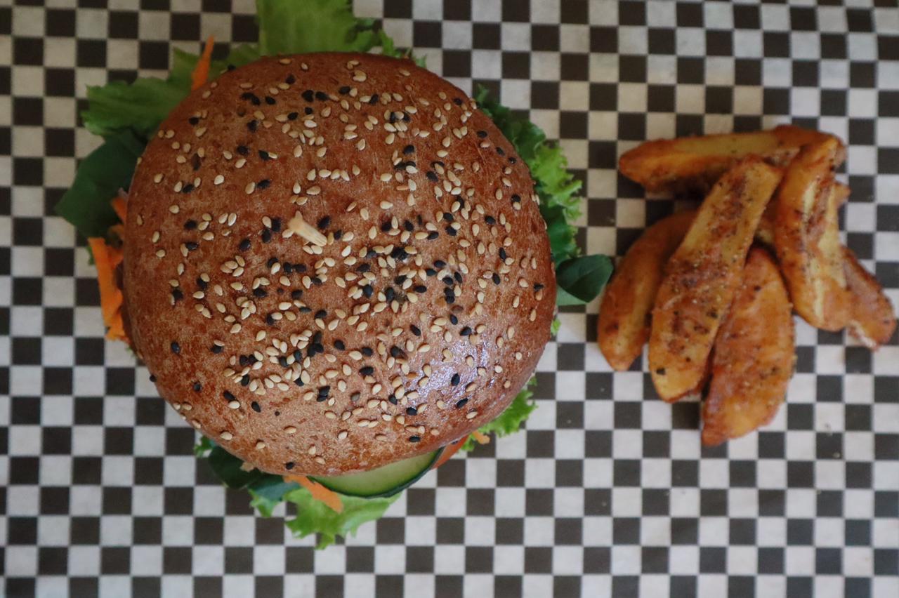 Pan artesanal con mayonesa de ajo, 200 te de medallón de avena y vegetales, queso fundido, lechuga, jitomate, zanahoria, cebolla, pepino acompañada de papas gajo.