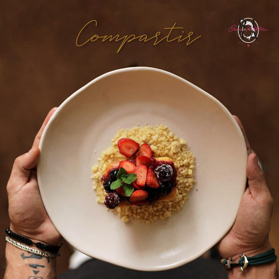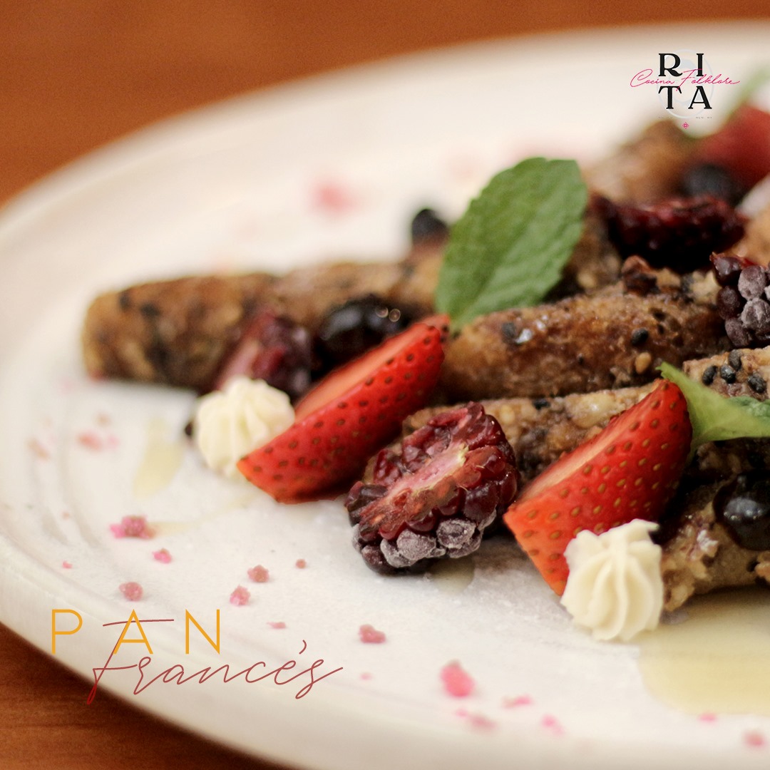 Pan de caja hidratado en una mezcla de huevo azúcar y canela acompañado de frutos rojos