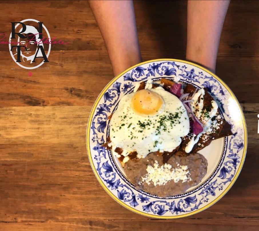 Tortilla frita en salsa de tomate acompañado de un huevo estrellado o pollo, frijoles queso y crema