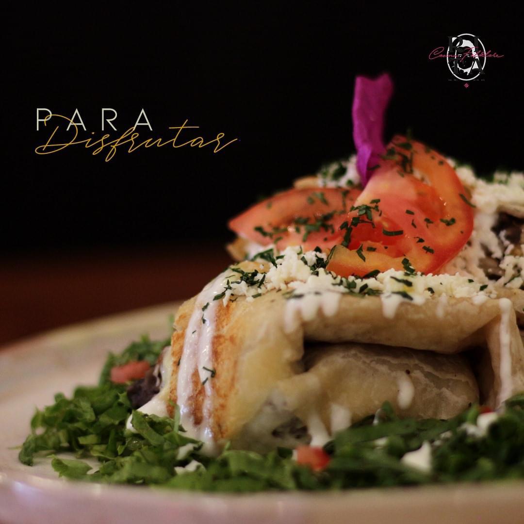 Tortilla de harina, con costra de queso asadero, frijoles, pollo o bistec de res servido en una cama de lechuga, crema y queso fresco. (Especificar tortilla de nopal, chipotle ó nopal)