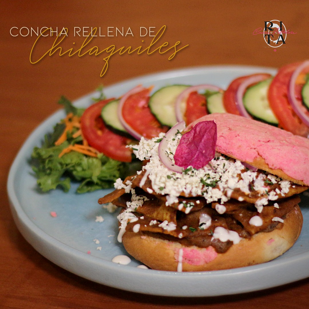 Concha rellena de chilaquiles rojos verdes o tarascos.