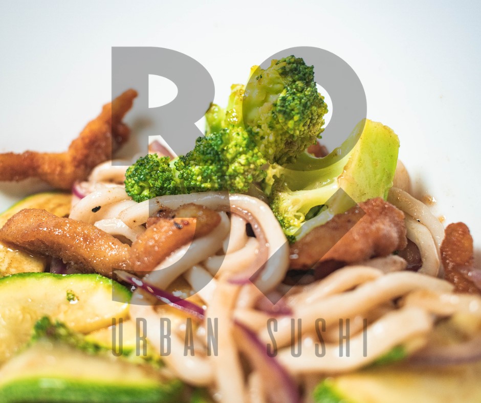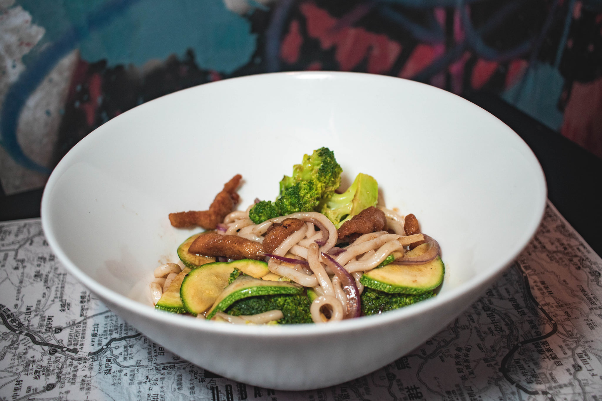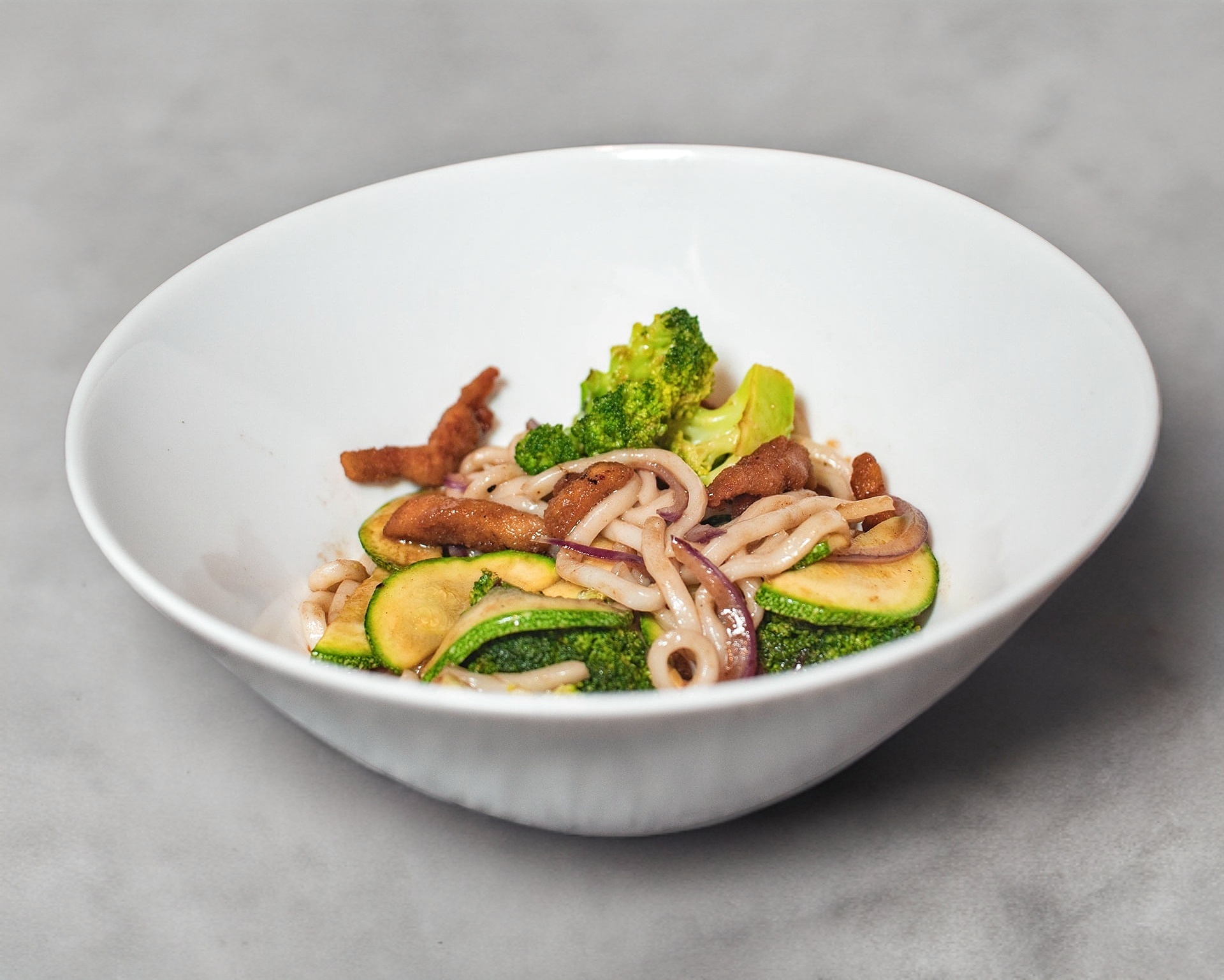 Bowl agridulce, brócoli, pimientos, cebolla, calabaza, pasta udon y pollo crujiente.