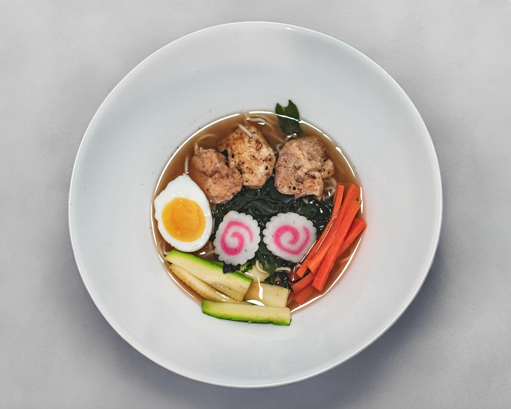 Fideos japoneses, pollo, zanahoria, calabaza, alga, naruto y camote frito.