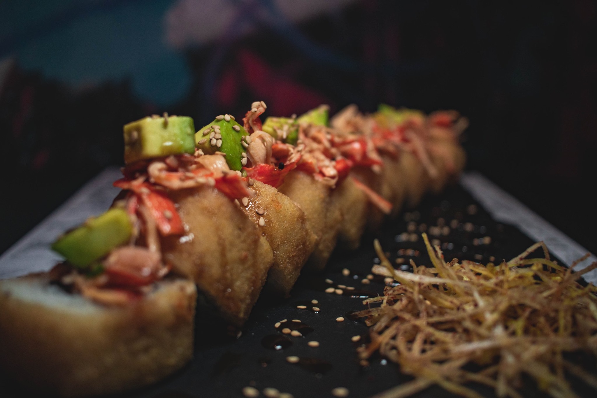 Un rollo, pepino, Philadelphia y aguacate, topping de pollo agridulce, ajonjolí y salsa de anguila.